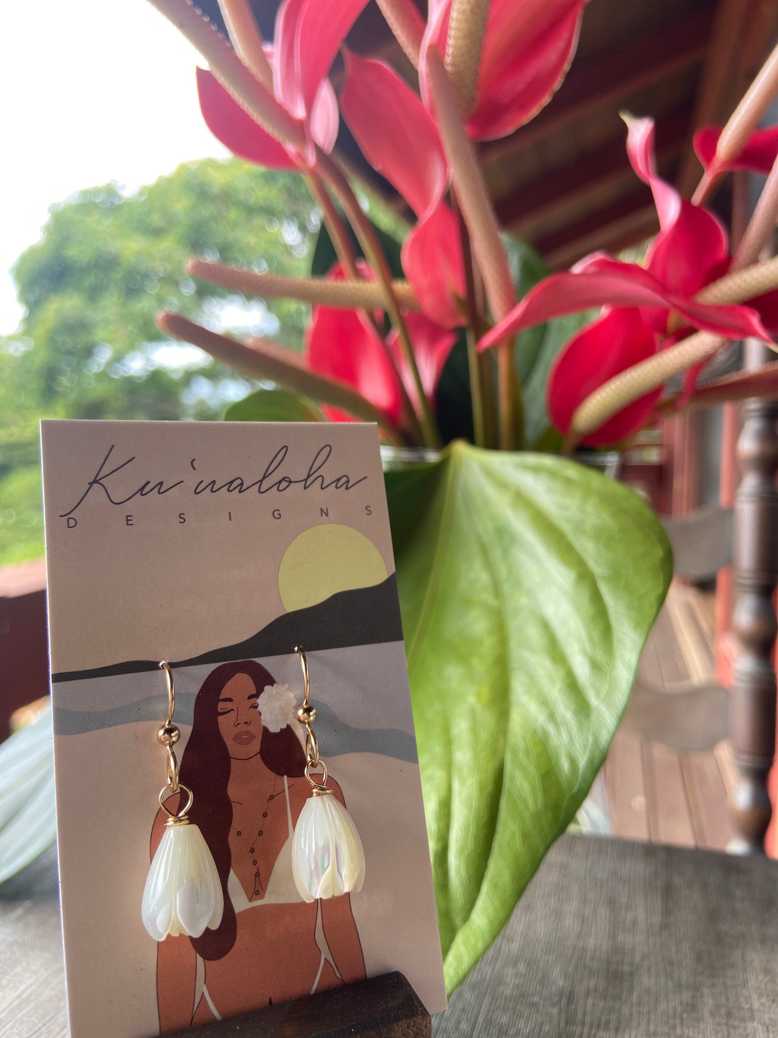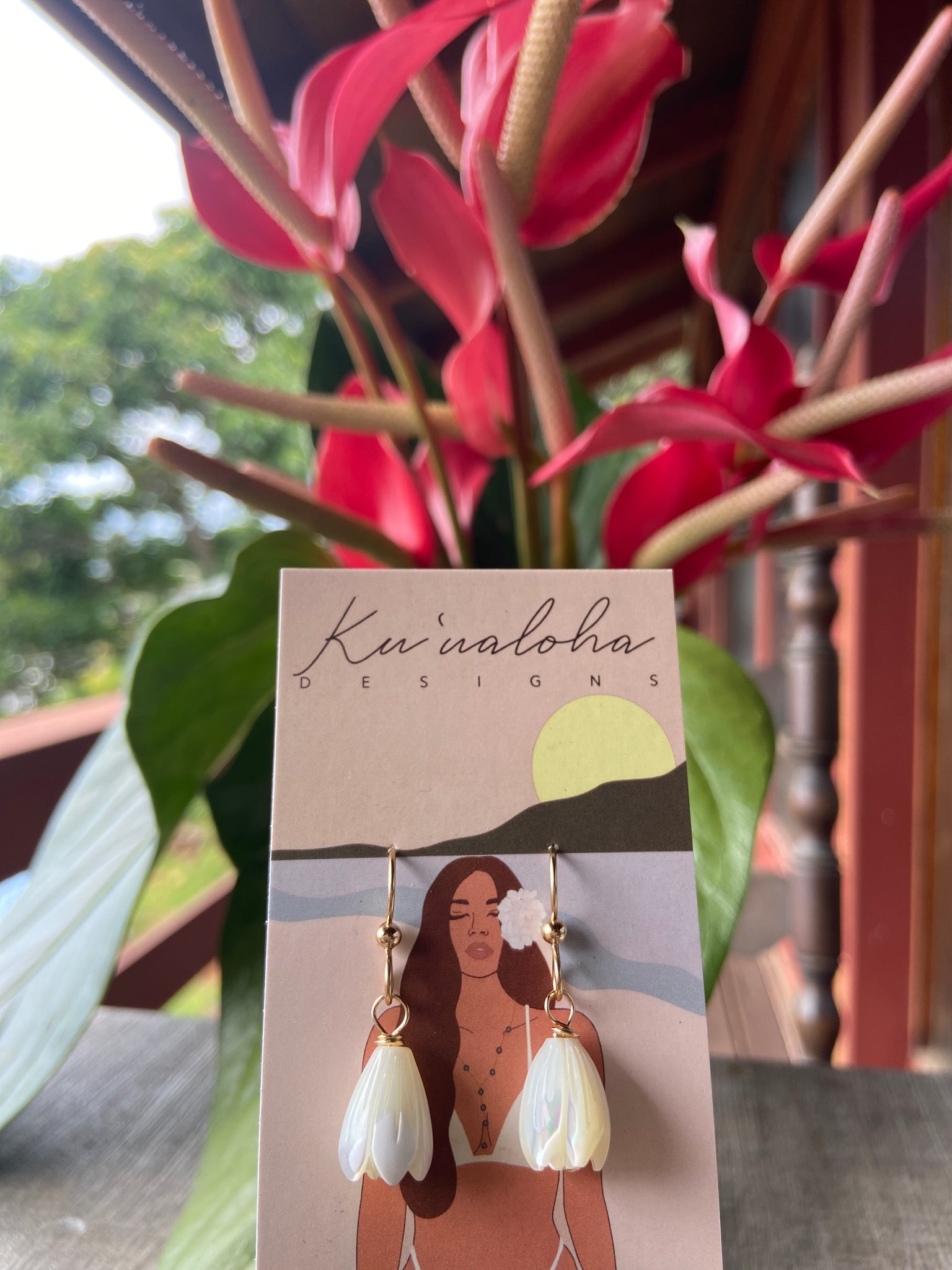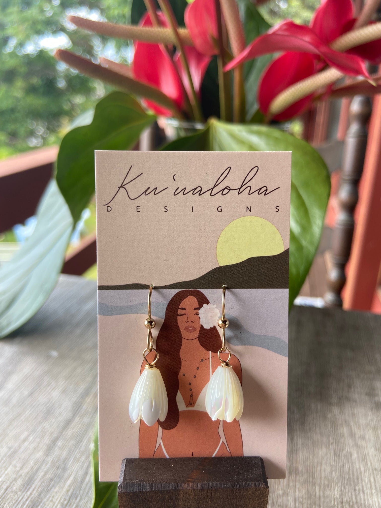 Beautiful mother of pearl pikake 13x10mm in size. 14k gold filled earrings hooks and wire.
