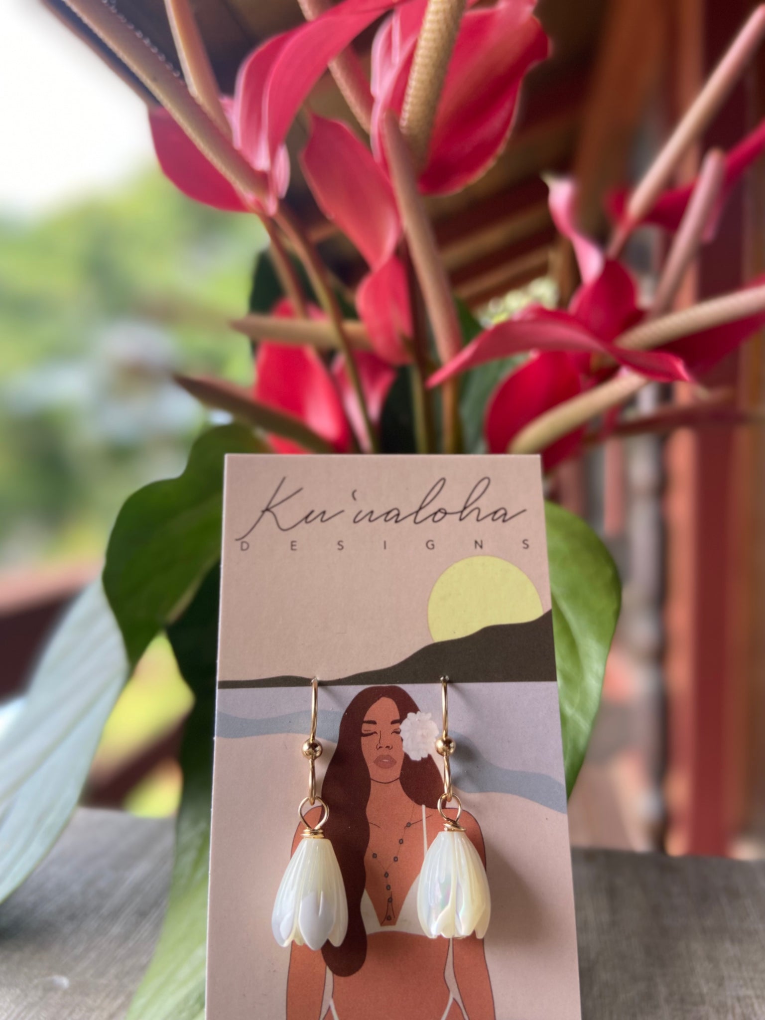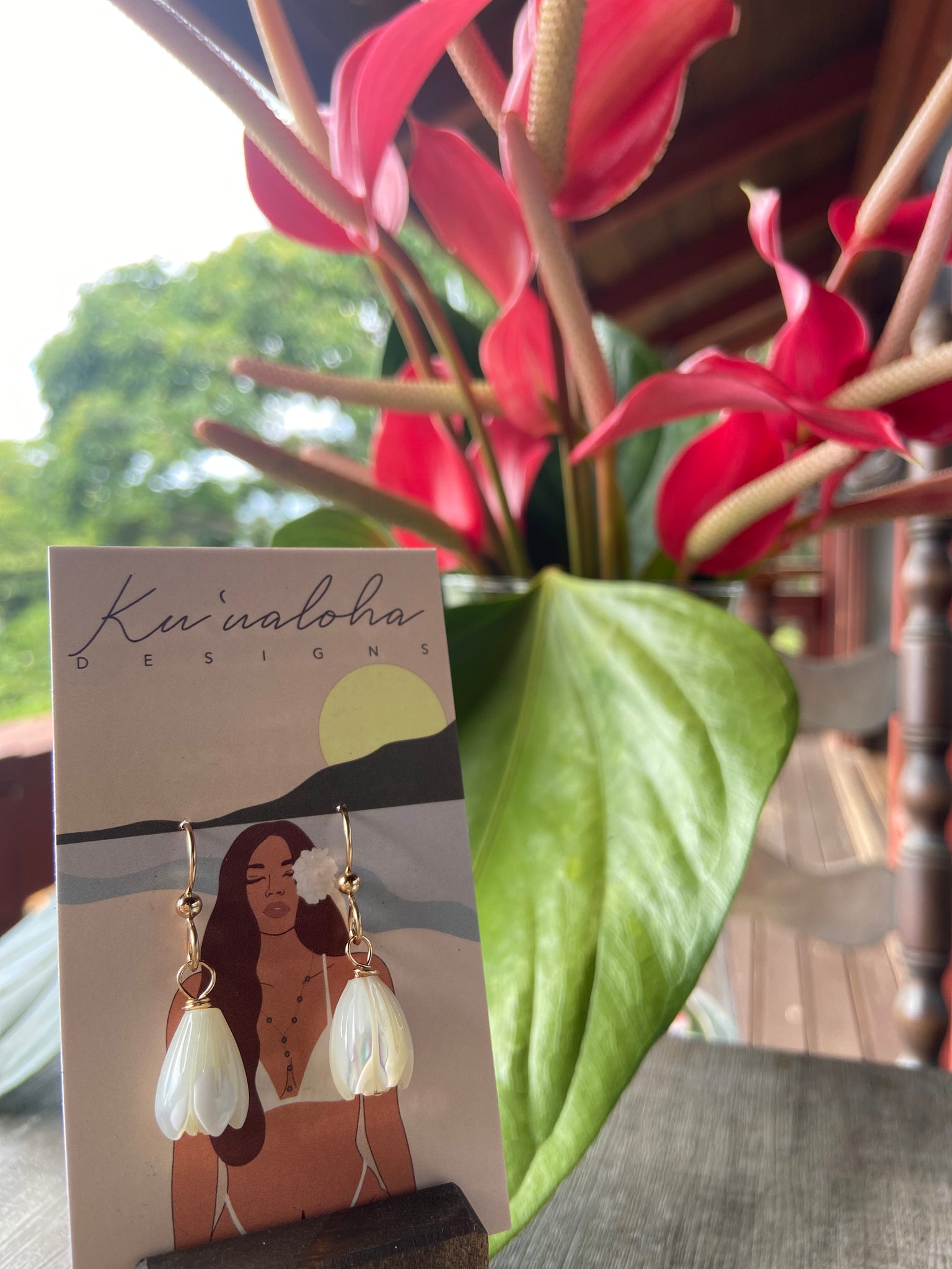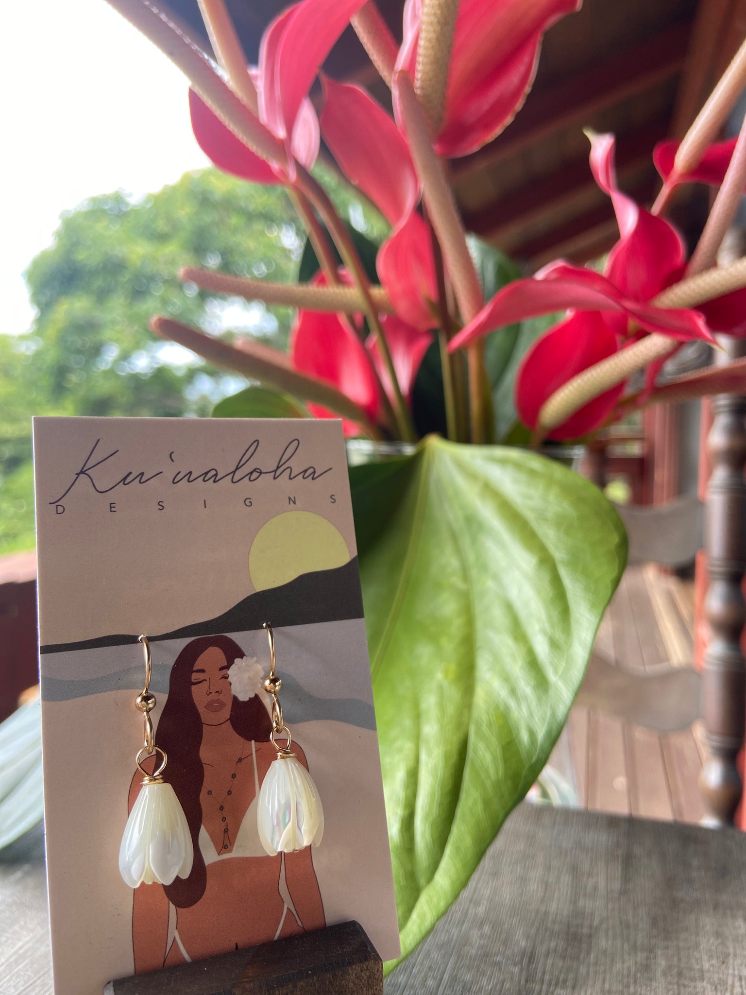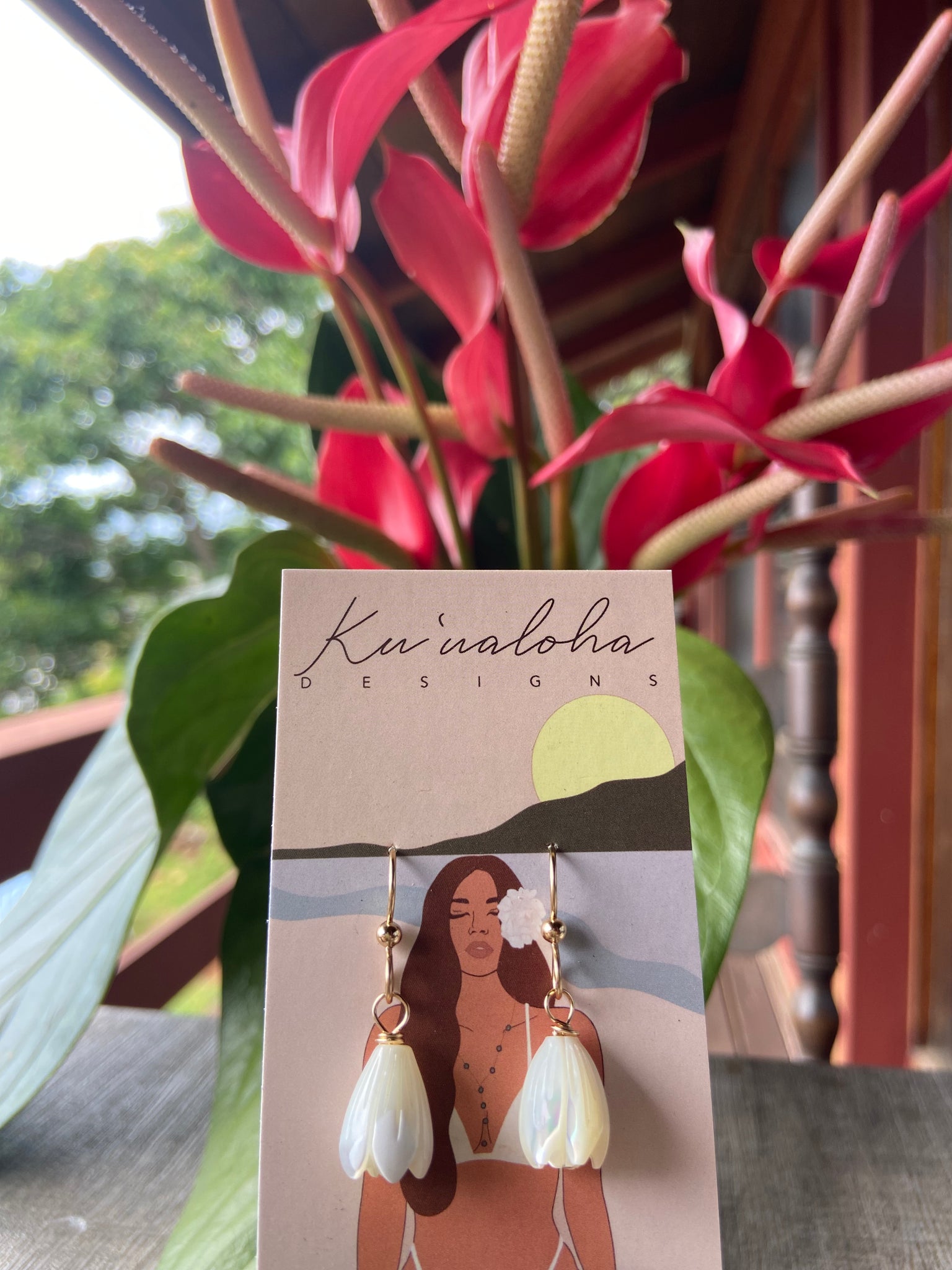 Beautiful mother of pearl pikake 13x10mm in size. 14k gold filled earrings hooks and wire.