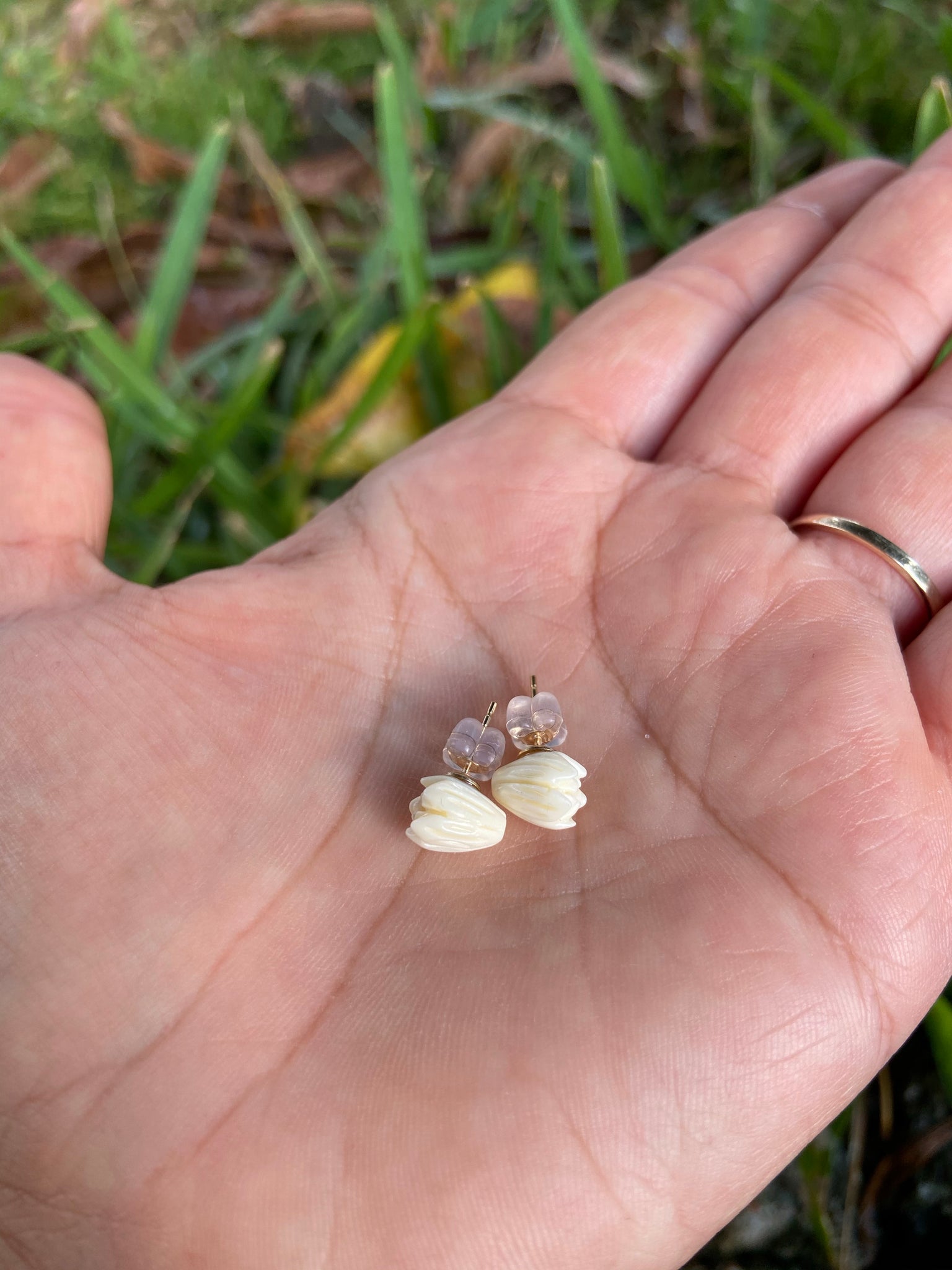 Lovely, hand carved Pikake flowers. These beautiful, Ivory earrings will be your everyday favorite. They are available in two sizes 8x7mm (small) or 10x8mm (medium). Posted on 14k gold filled setting.