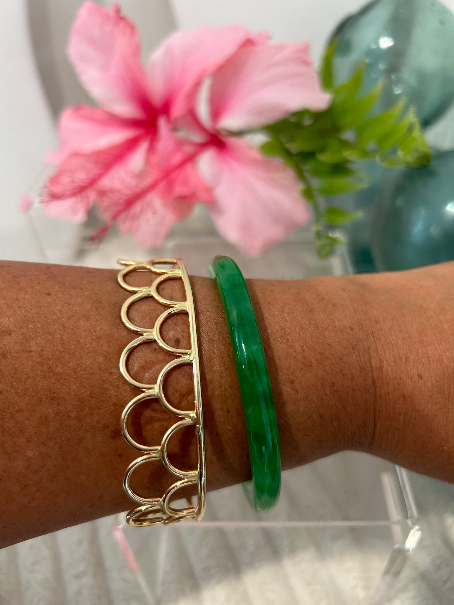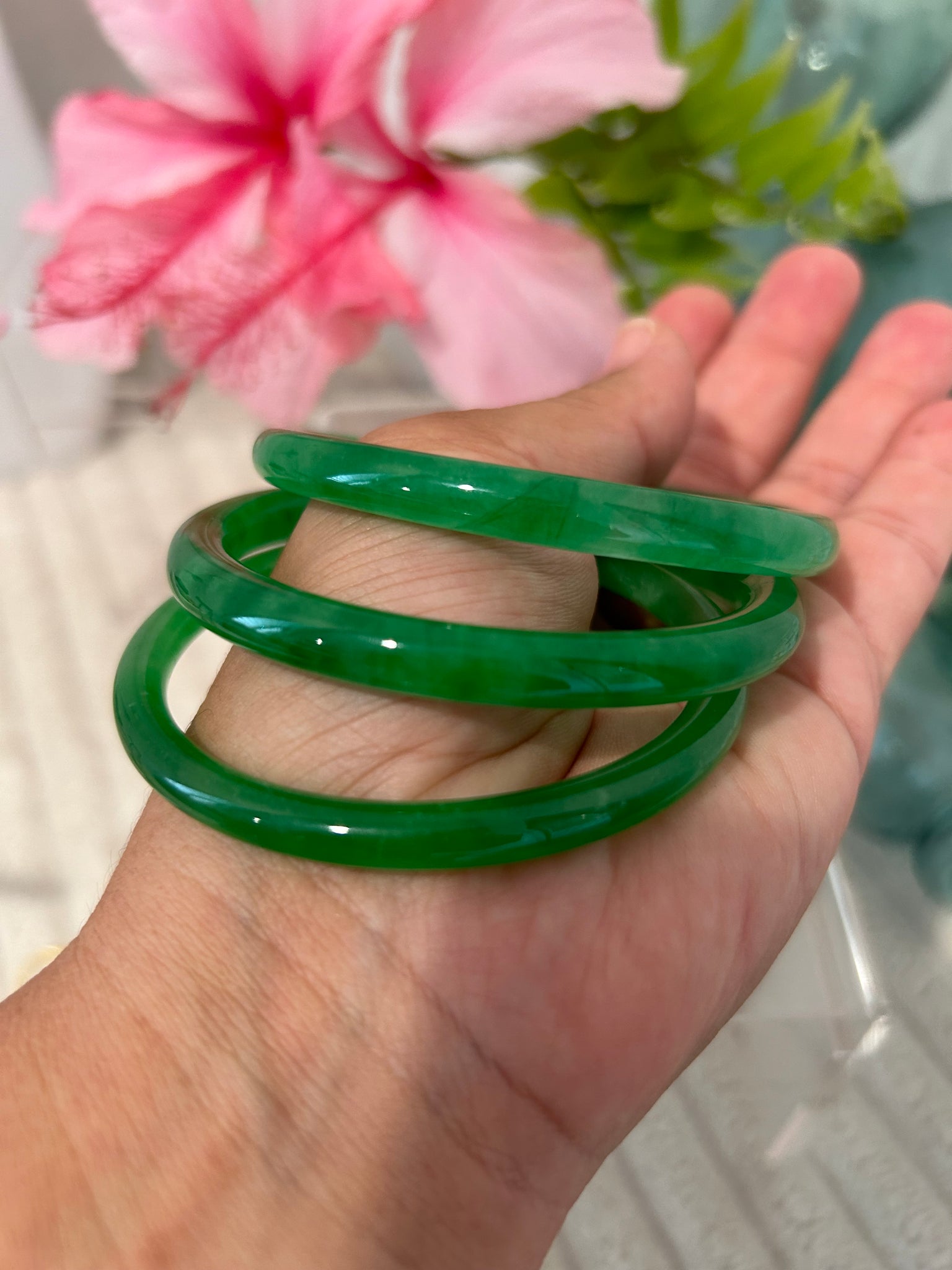 Beautiful, natural dark green jade. Thin 1/4” thick, round bracelets. Sold individually.