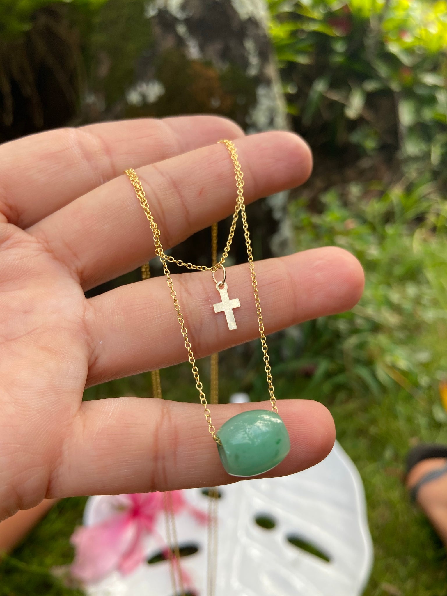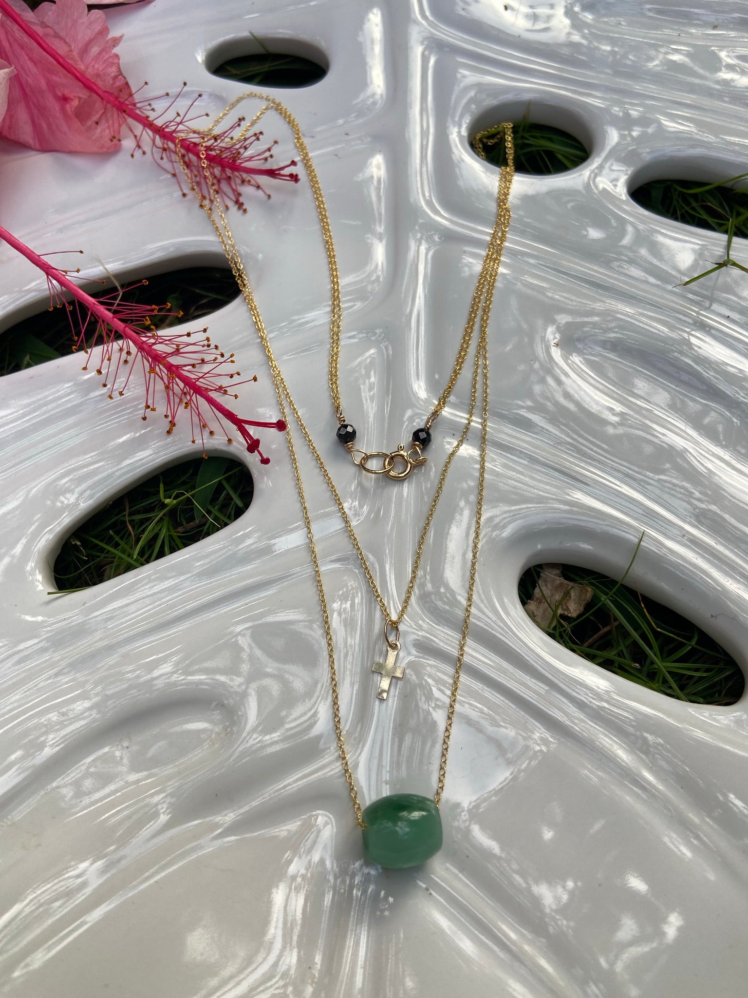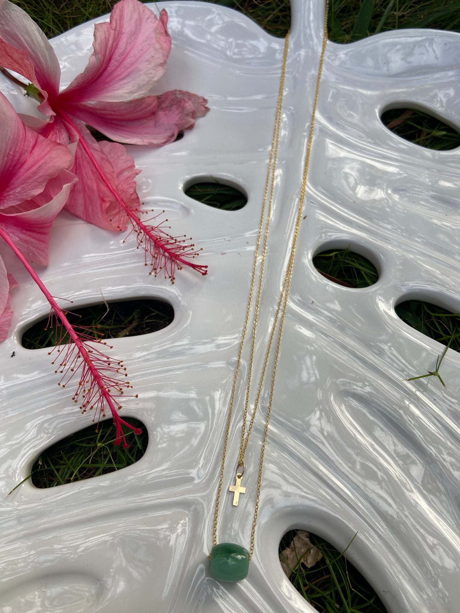 Beautifully hand crafted necklace made with 14k gf chain and premium clasP work. 17” chain with cross, 18” chain with green Jade, combined into one clasp for easy layering.