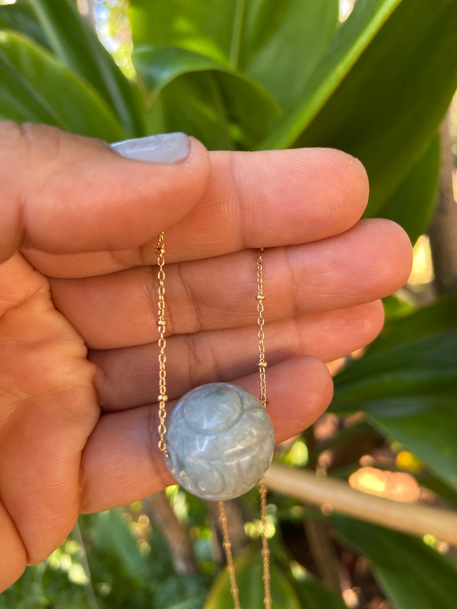 Large 20mm carved Jade necklace. 14k gold filled satellite chain.18” premium clasp work .