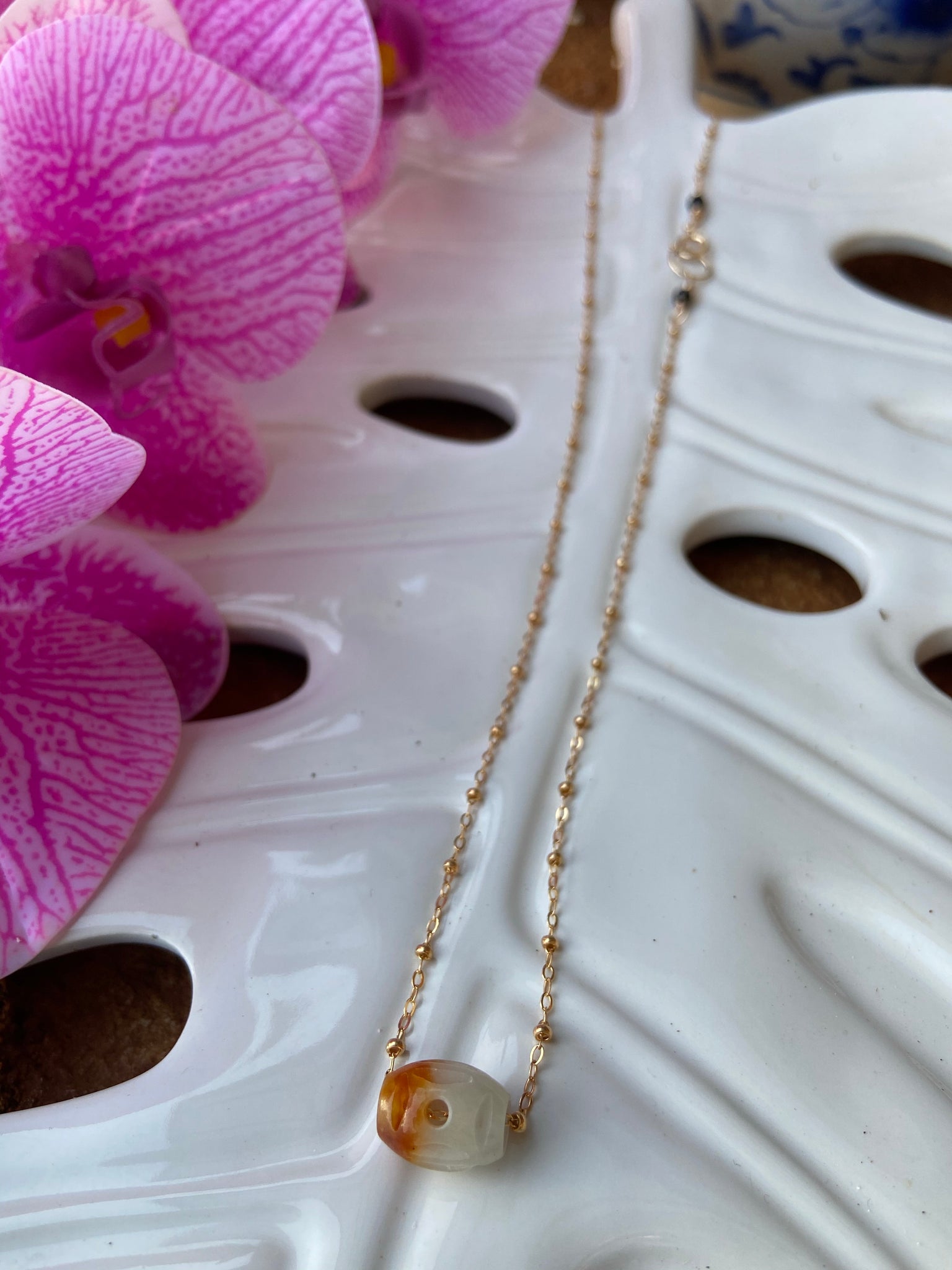 Beautiful 28” 14k gold filled chain with Vintage white/brown barrel Jade bead. Premium claspwork and endings.
