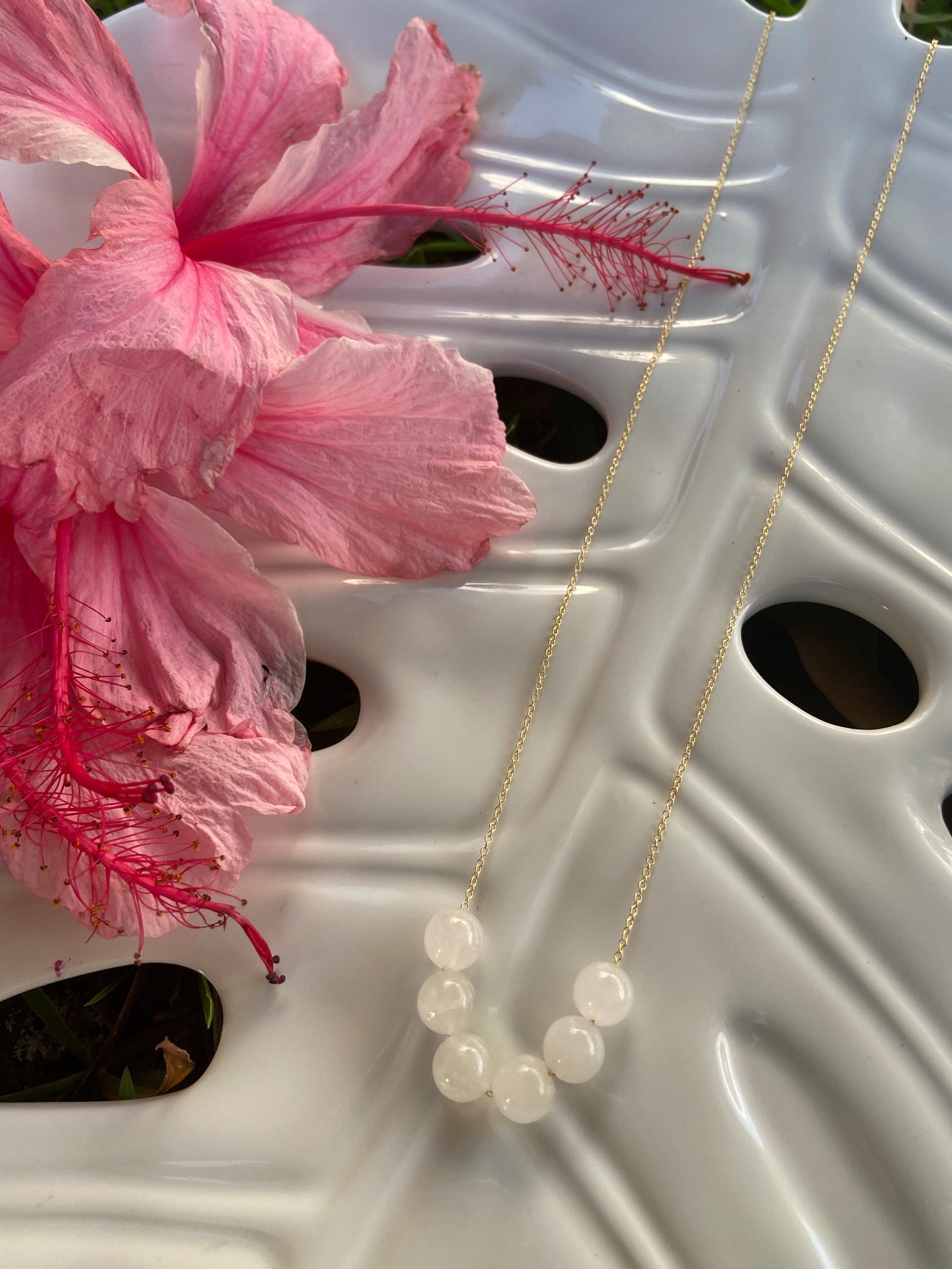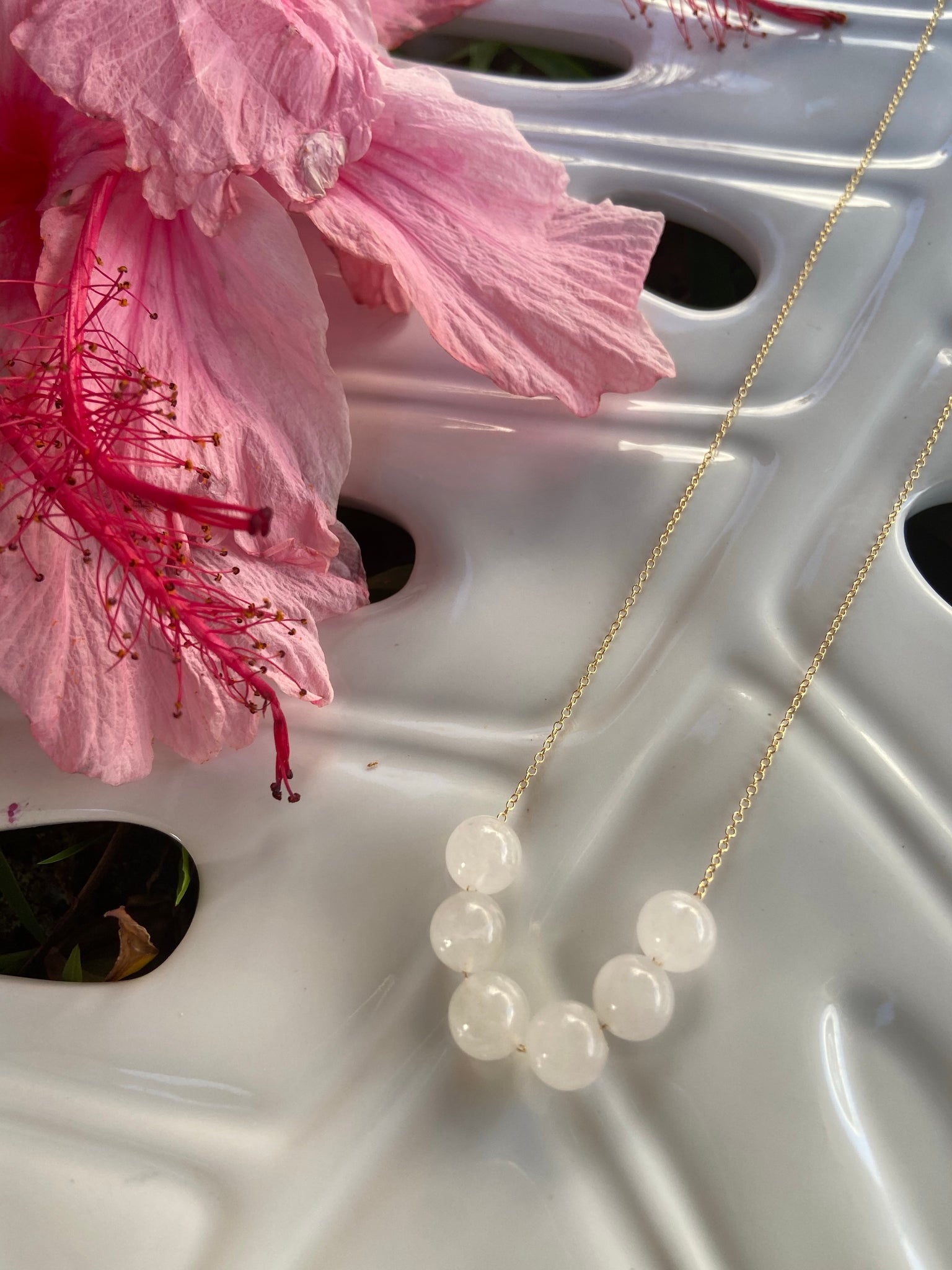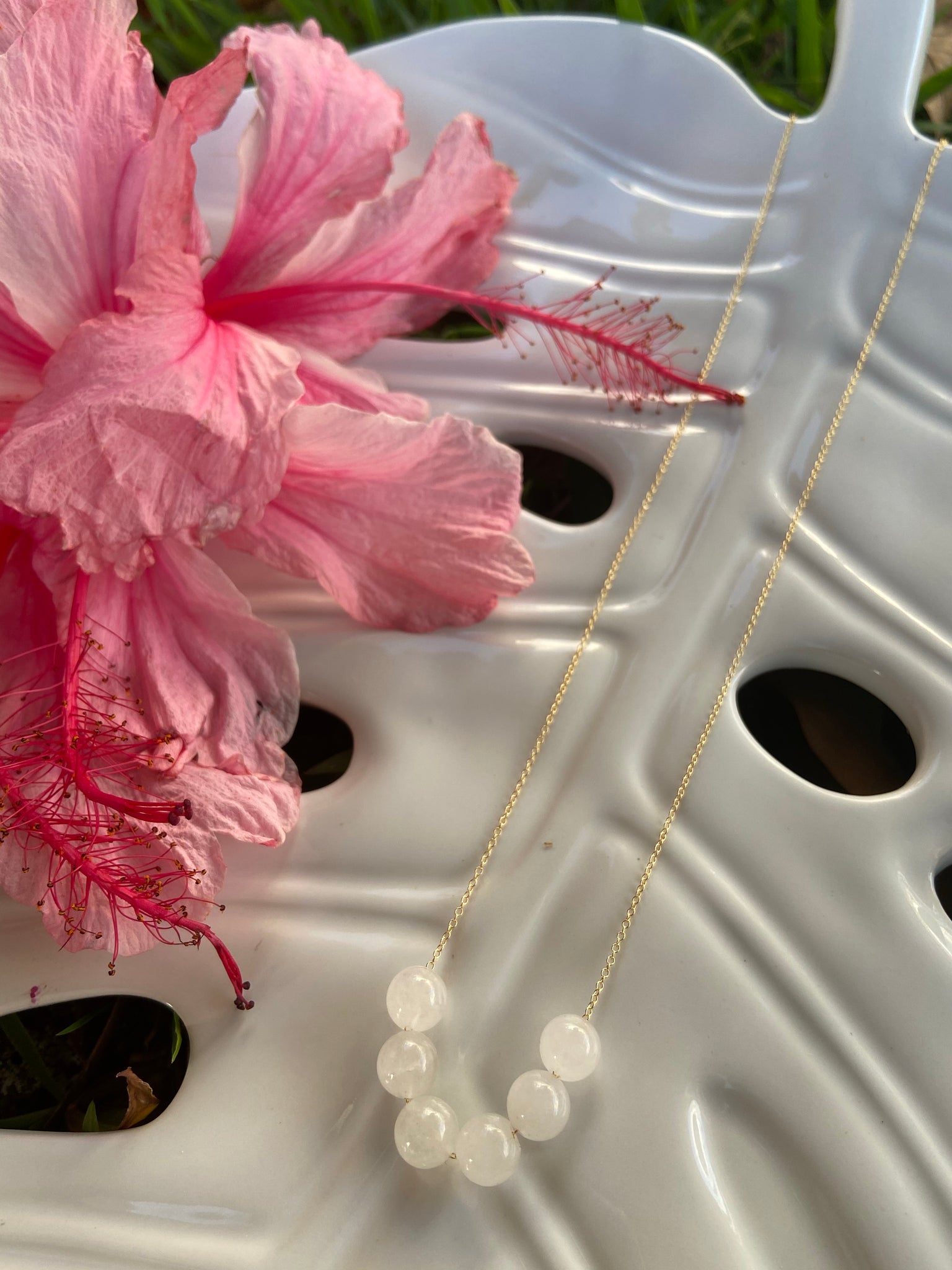 Beautiful white vintage jade beads 9mm in size. 14k gold filled chain.