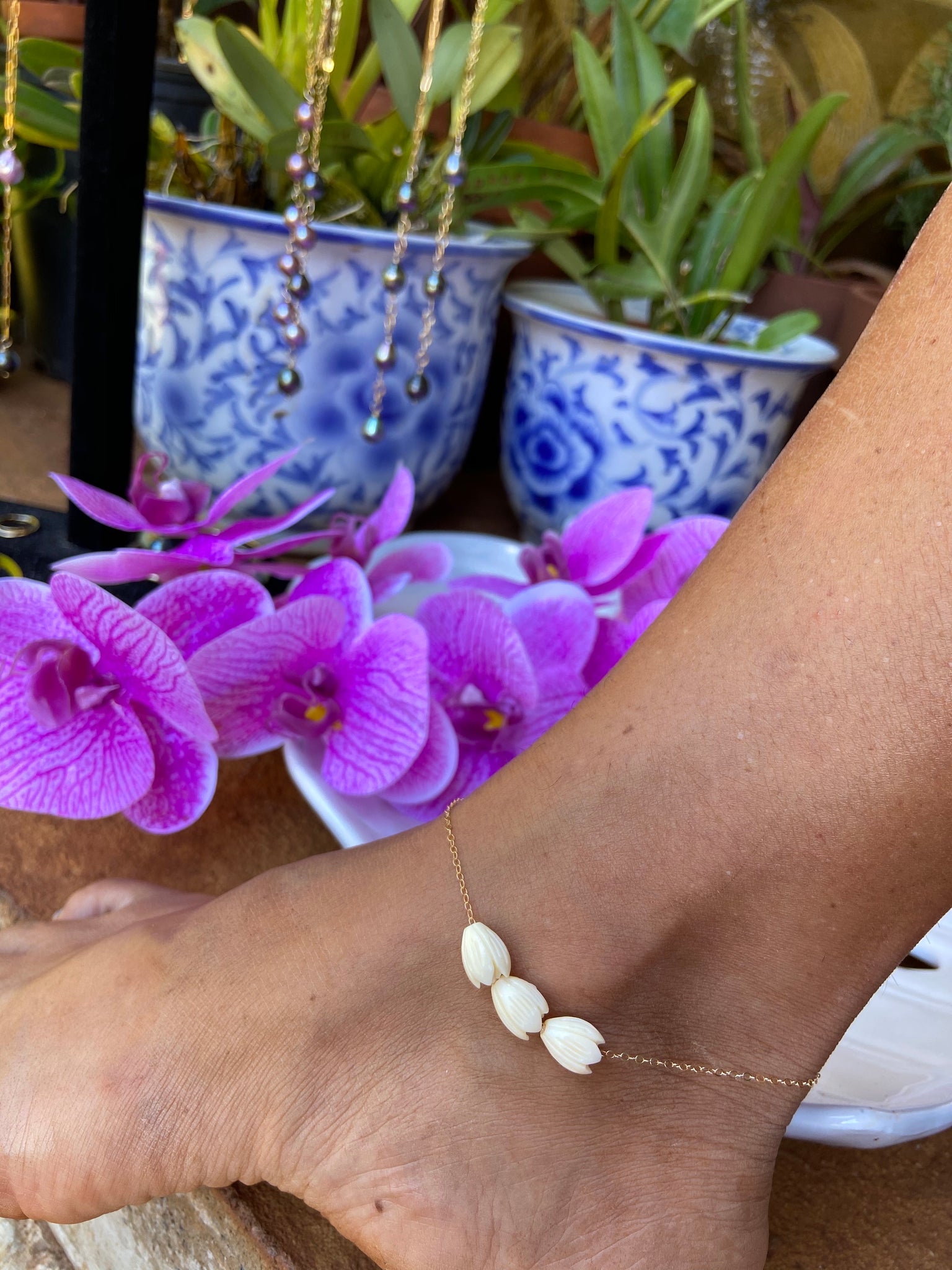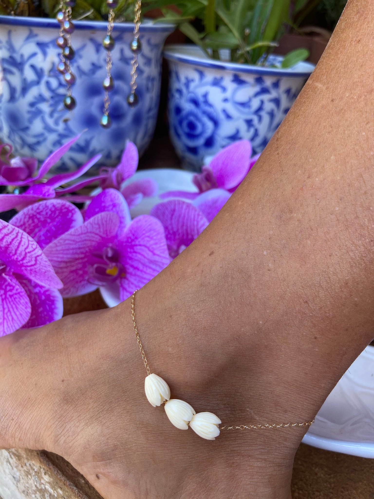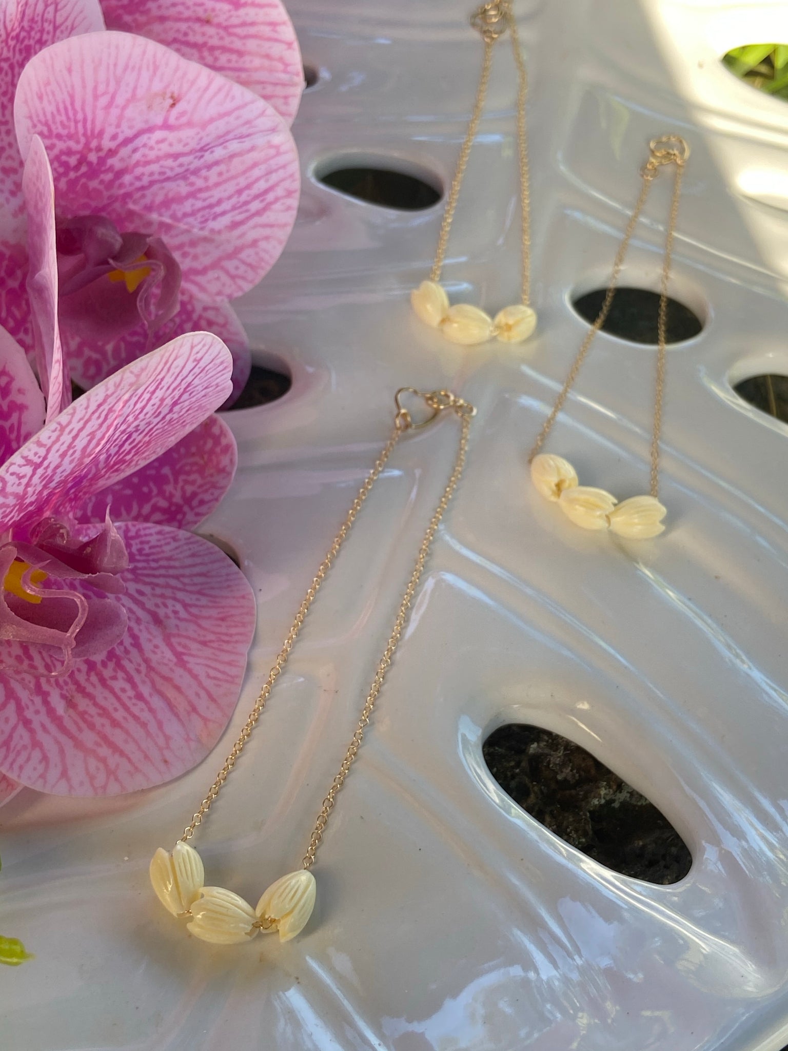 Three, beautifully hand carved Pikake flowers on 14k gf link chain. Premium clasp work and endings. Heart clasp.
