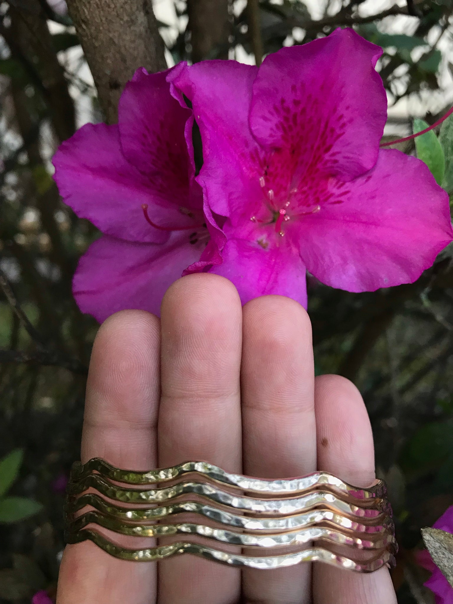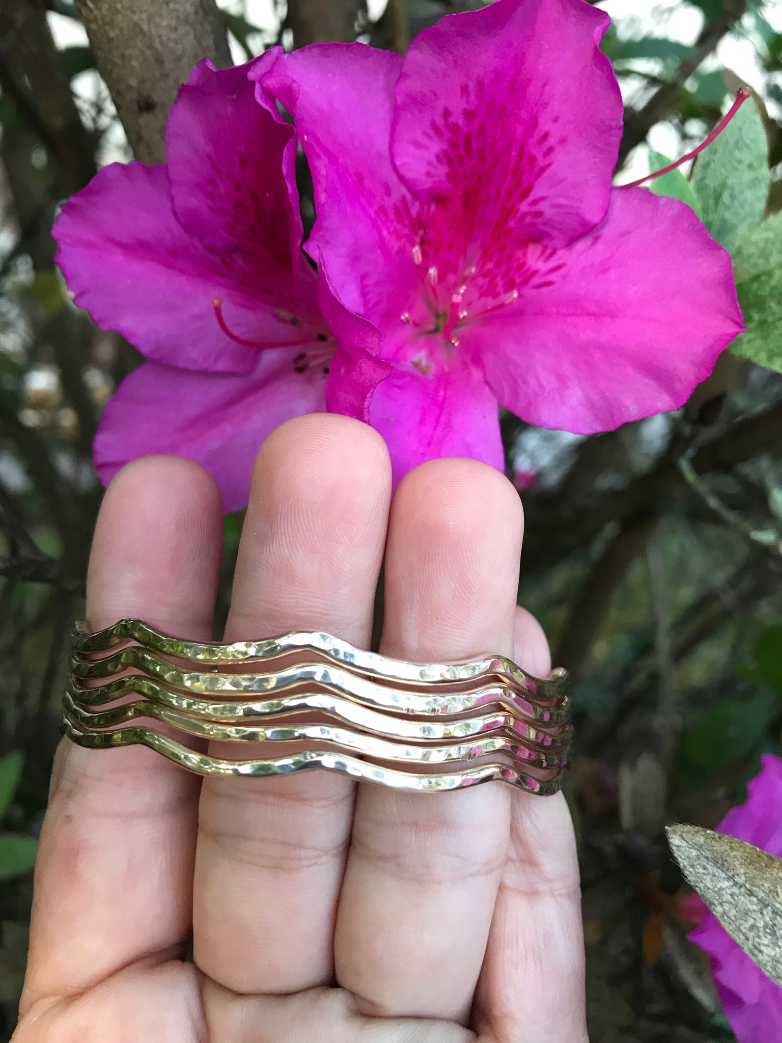Beautiful and thick, 14k gold filled Kainui bangles. Hand hammered and polished for texture and shine. These beautiful bangles are the perfect addition to any mermaid bangle stack. Sold individually and made to order. Turn around time is 2-3 business days.