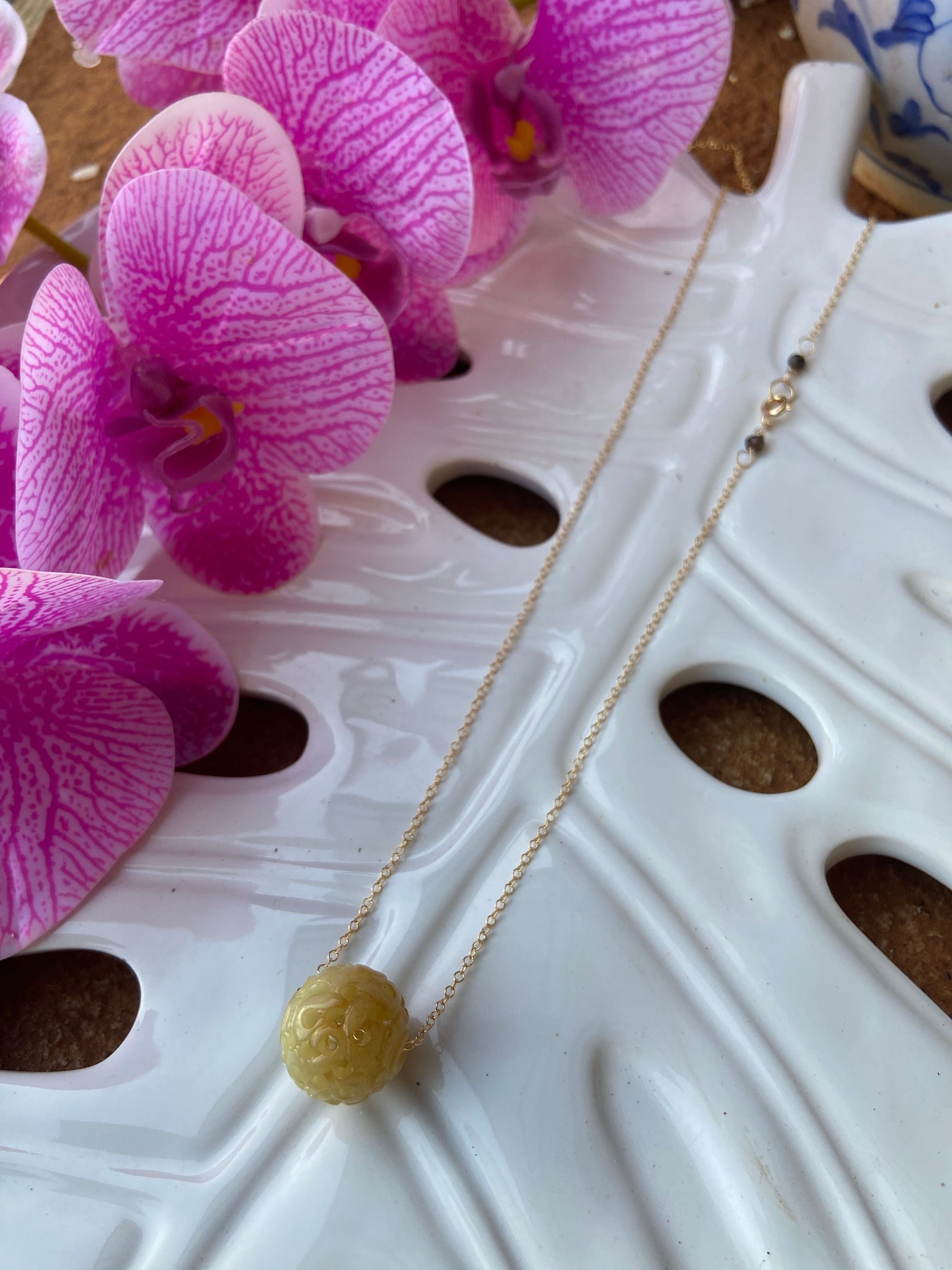 Very rare, hand carved vintage Jade yellow/brown in color 20mm in size. 28” 14k gold filled chain with premium claspwork and endings.
