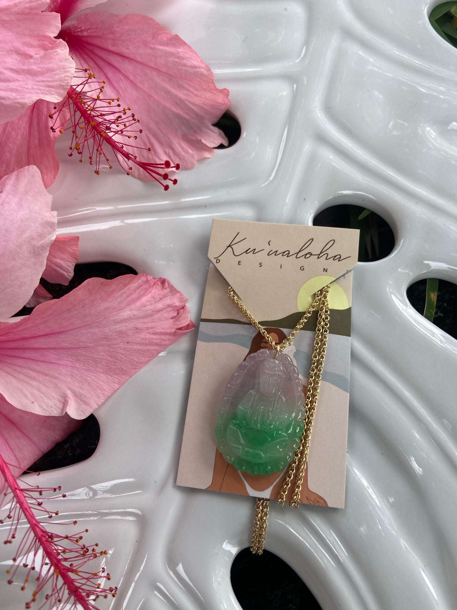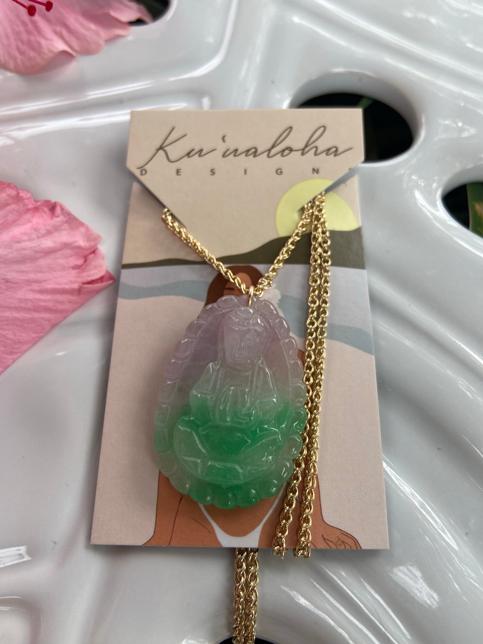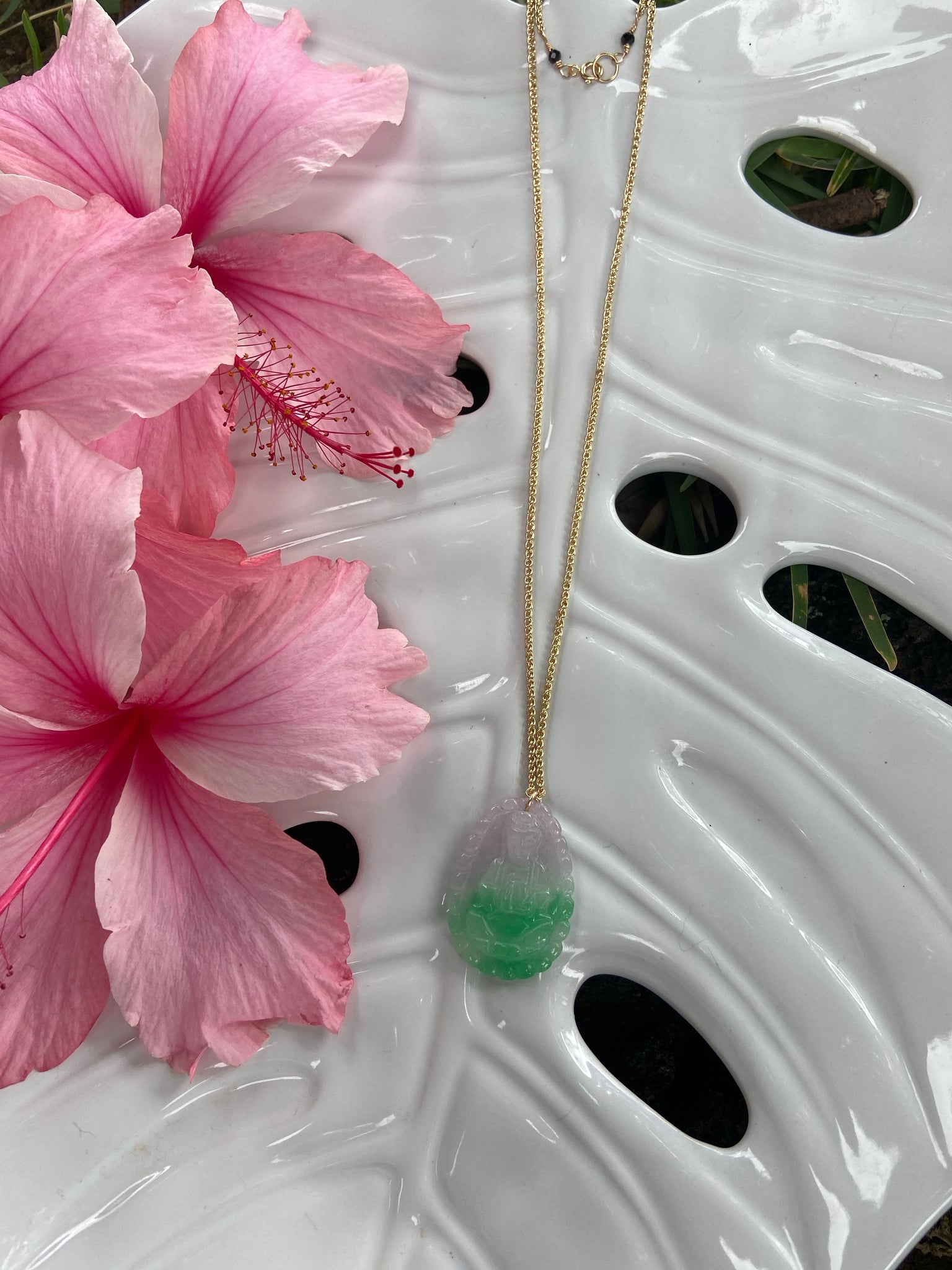 Beautiful, natural Buddha jade pendant on 20” chain. 14k gold filled chain 1.8mm thick with premium clasp work. Rich lavender and green in color. Very rare piece.