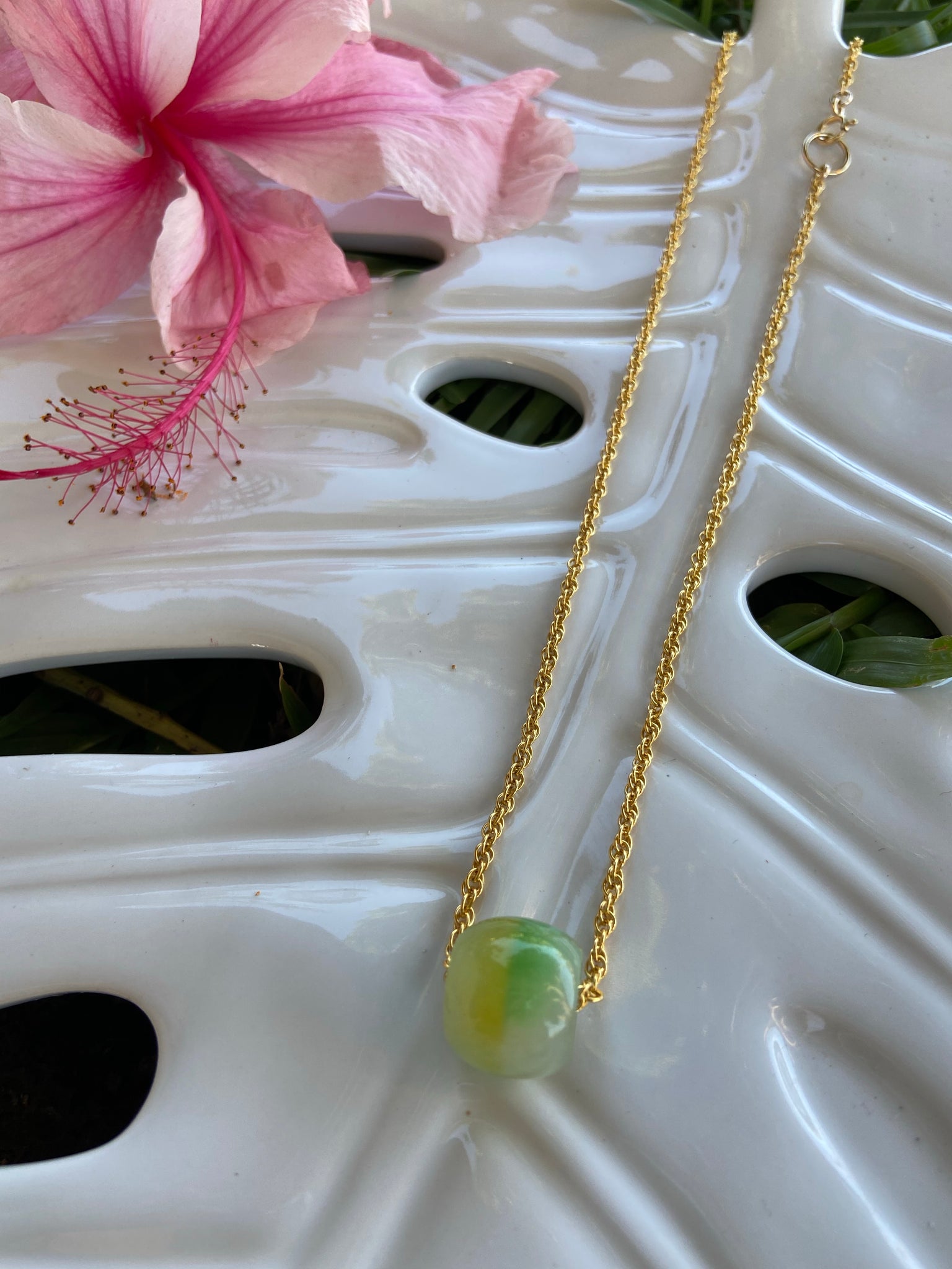 Gorgeous, large, highest quality Burma jade floating on 18” rope chain. 14k gold filled 2mm.