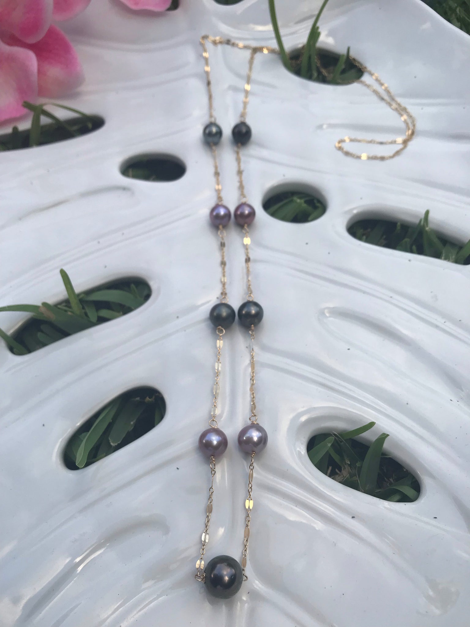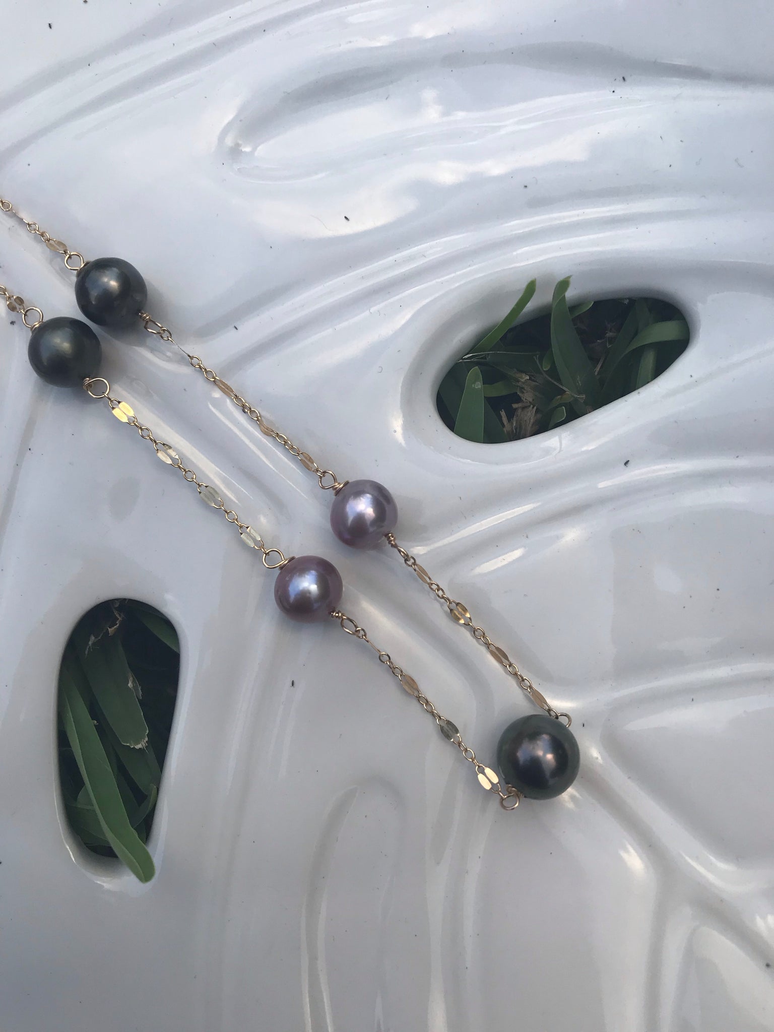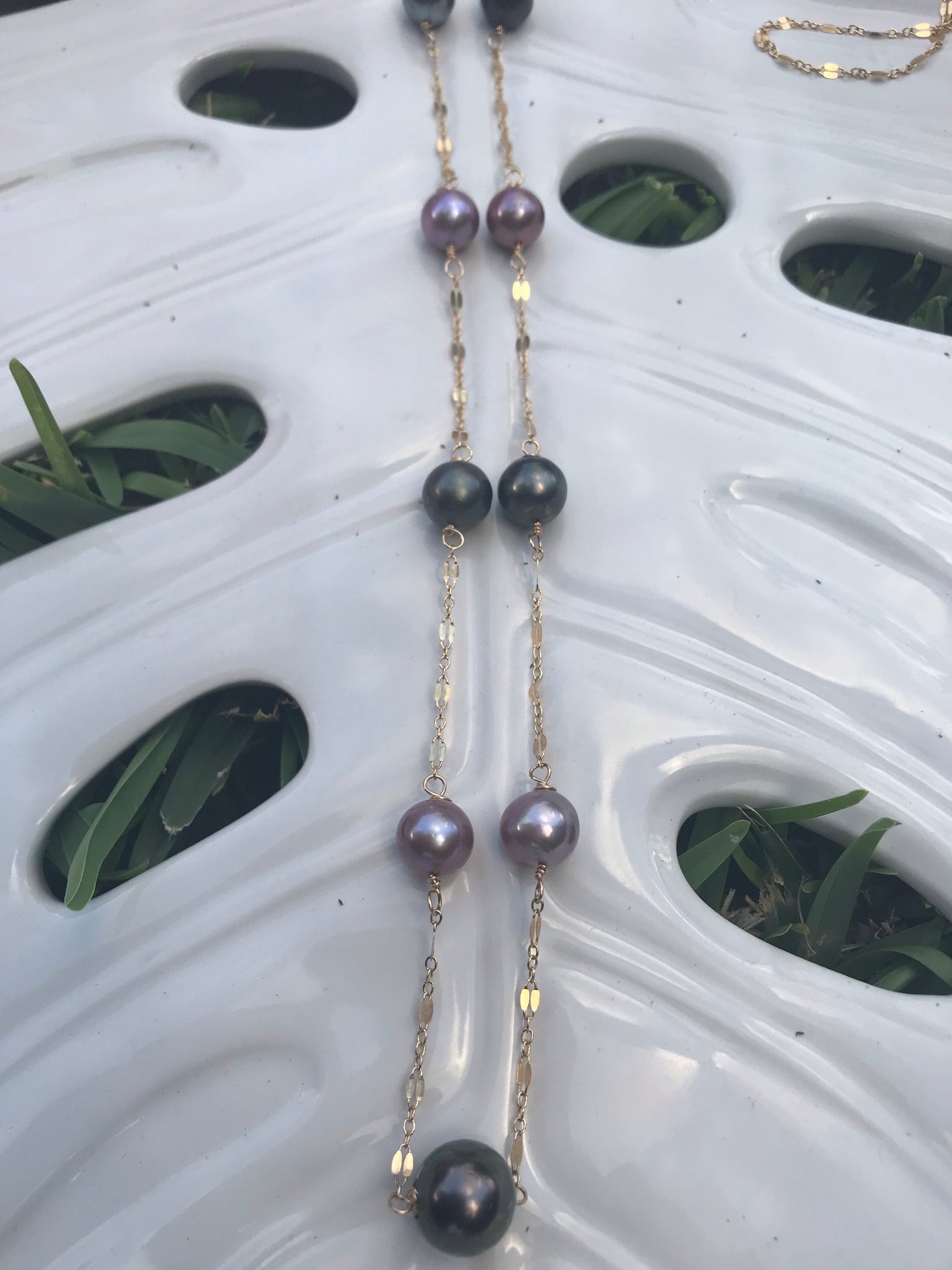 Tahitian and Edison pearl necklace. Made with dark premium pearls 11-12mm in size. 14k gold filled (not plated) chain and endings. This gorgeous necklace is 27” long but can be made to your specific length.