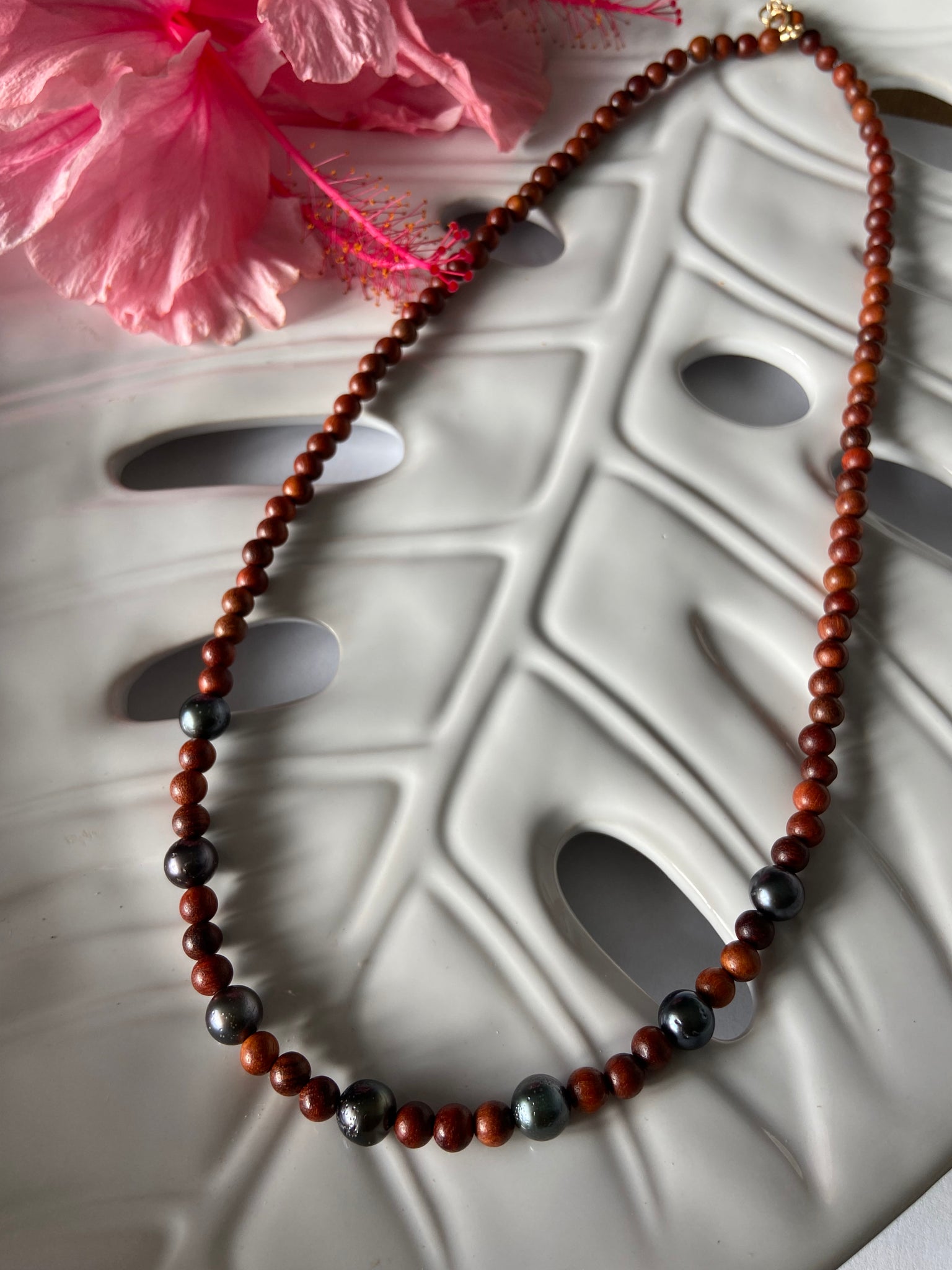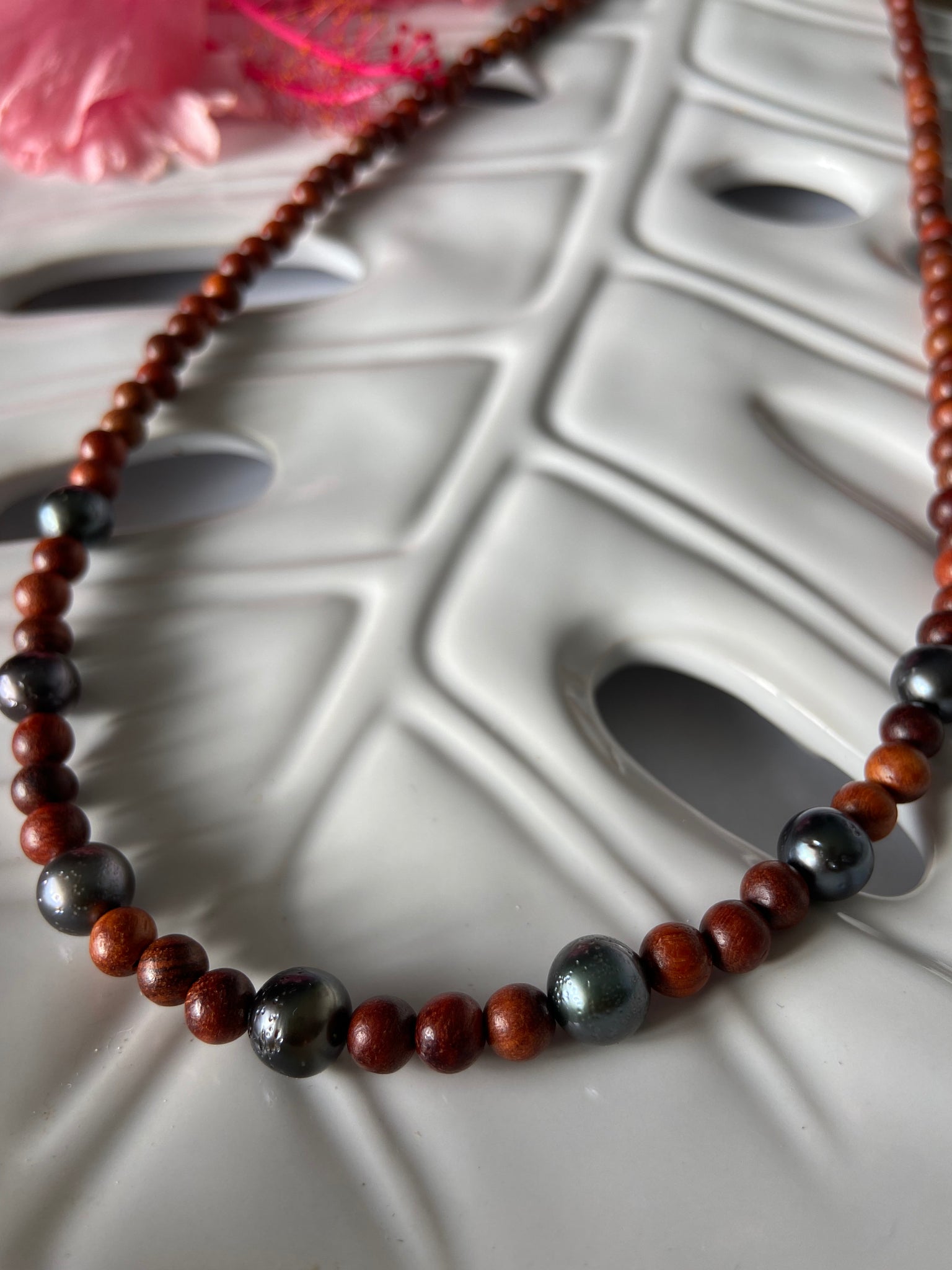 Beautifully hand crafted design. Made with 11MM Tahitian pearls AAA in quality. Sandalwood beads and worn best as a long necklace, made at 28””