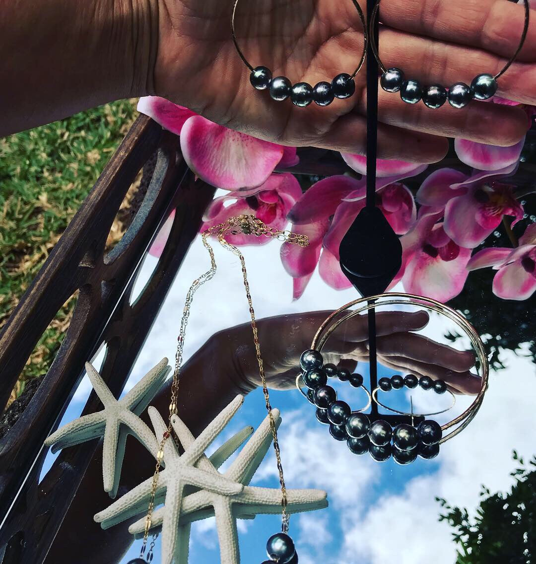 Tahitian pearl hoop earrings. 5 beautiful Tahitian pearls 8-9mm in size on 14k gold filled wire, 14 gauge.