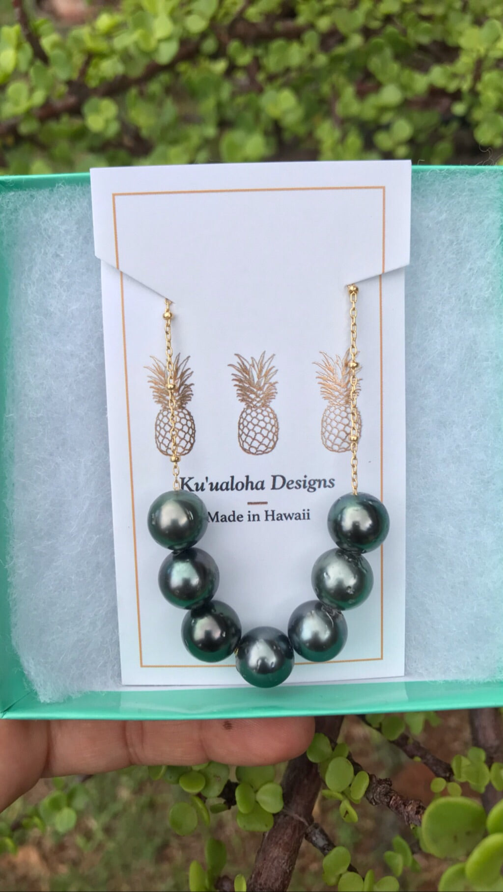 The perfect statement piece. Made with AAA, dark, lush, Tahitian pearls. Colors range from green, black and peacock. Made with a beautiful 14k gold filled chain and premium claspwork.