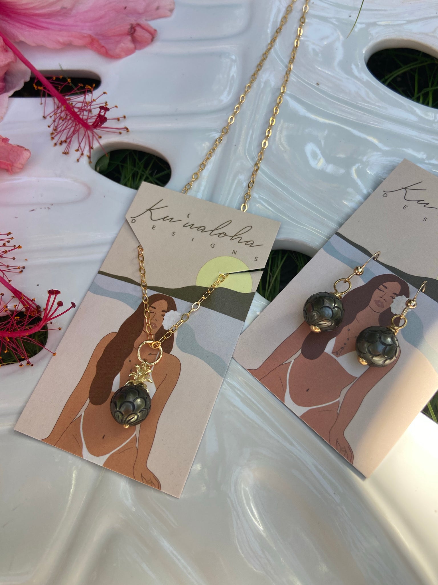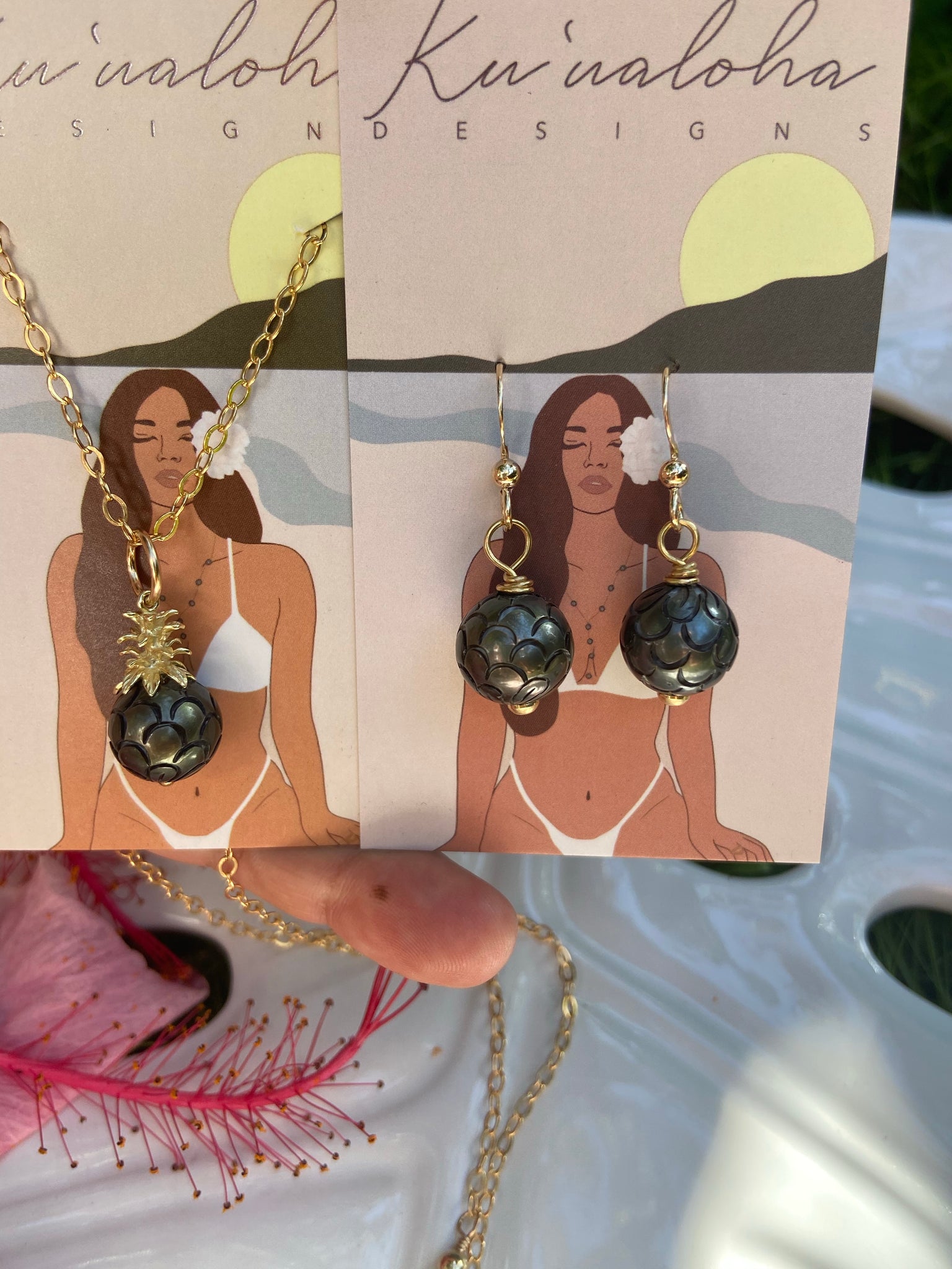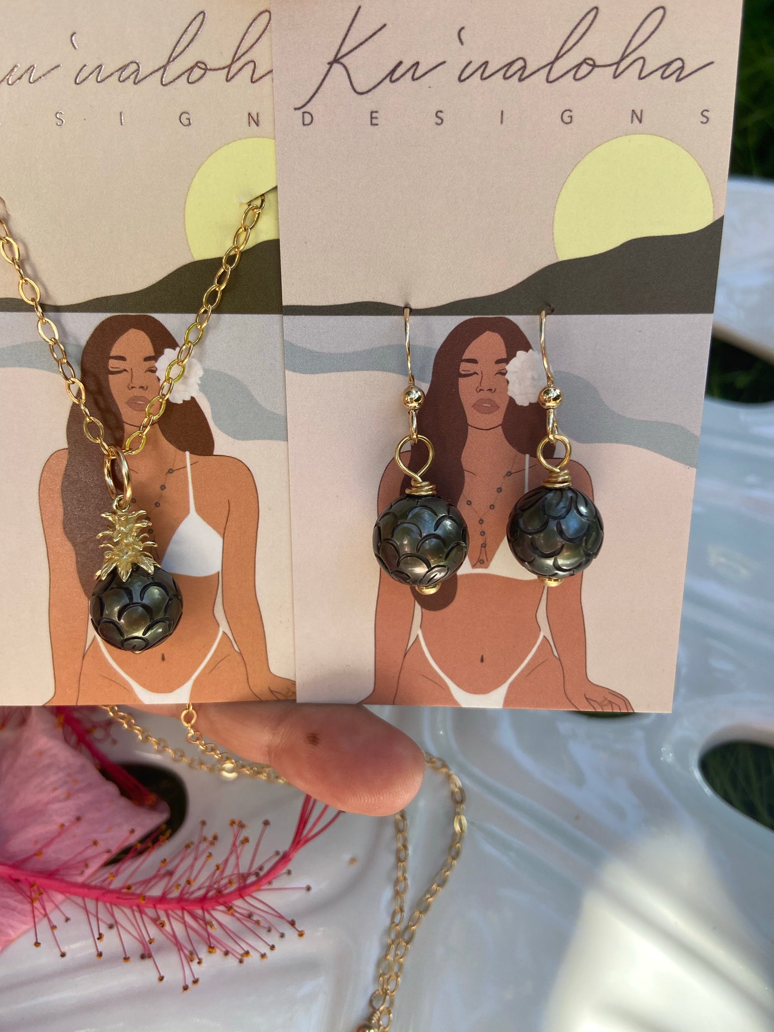 18” pineapple necklace make with hand carved Tahitian pearl 12mm. Includes mermaid earrings with 14k gf hooks. You will love this set!!