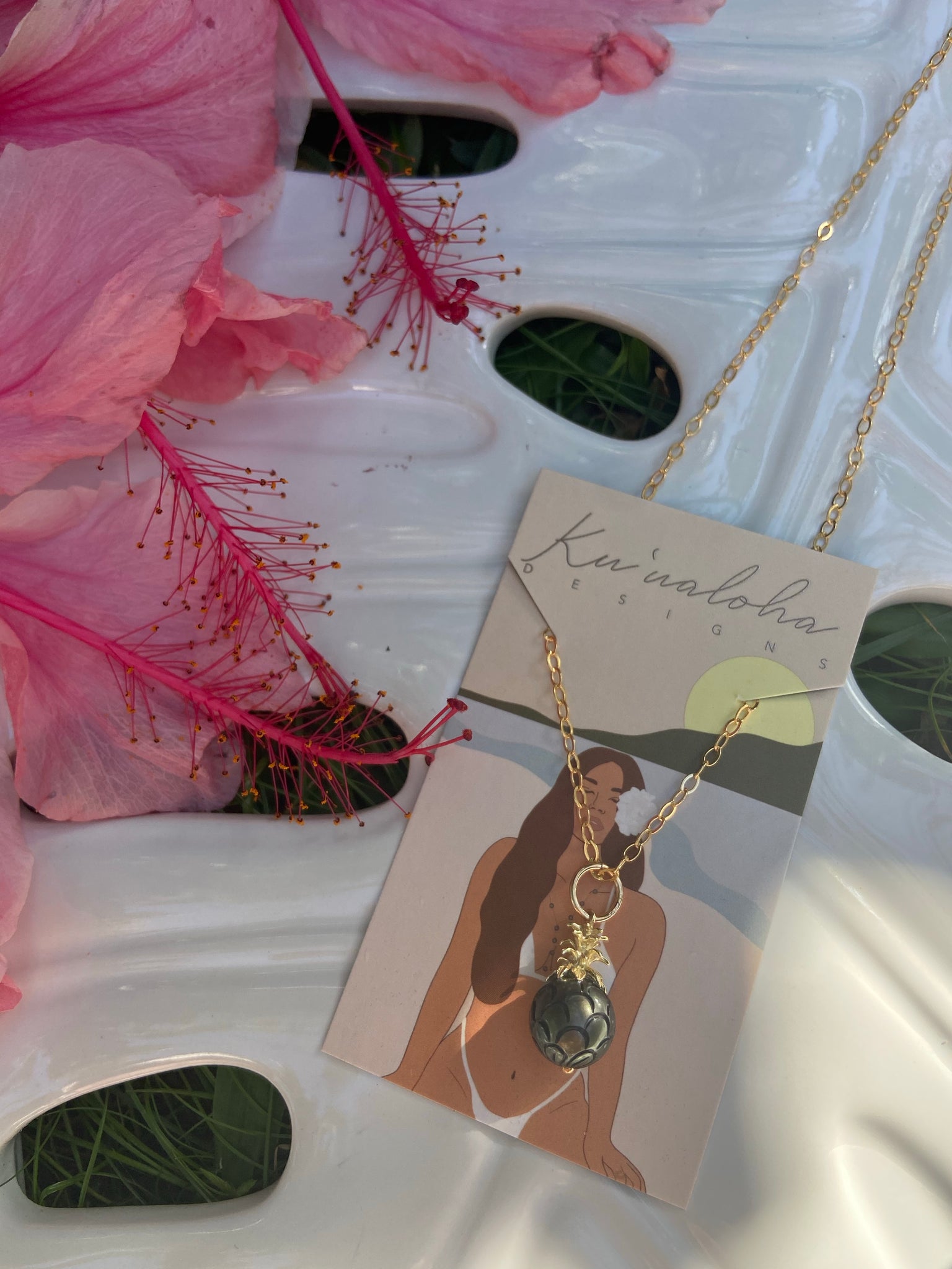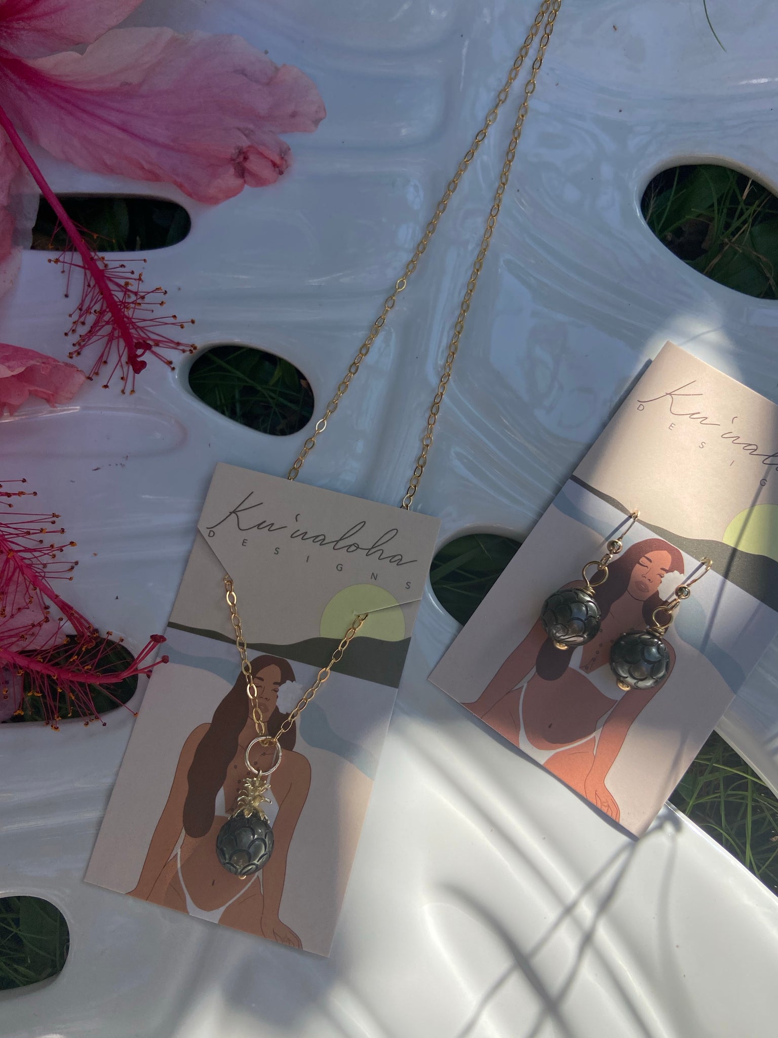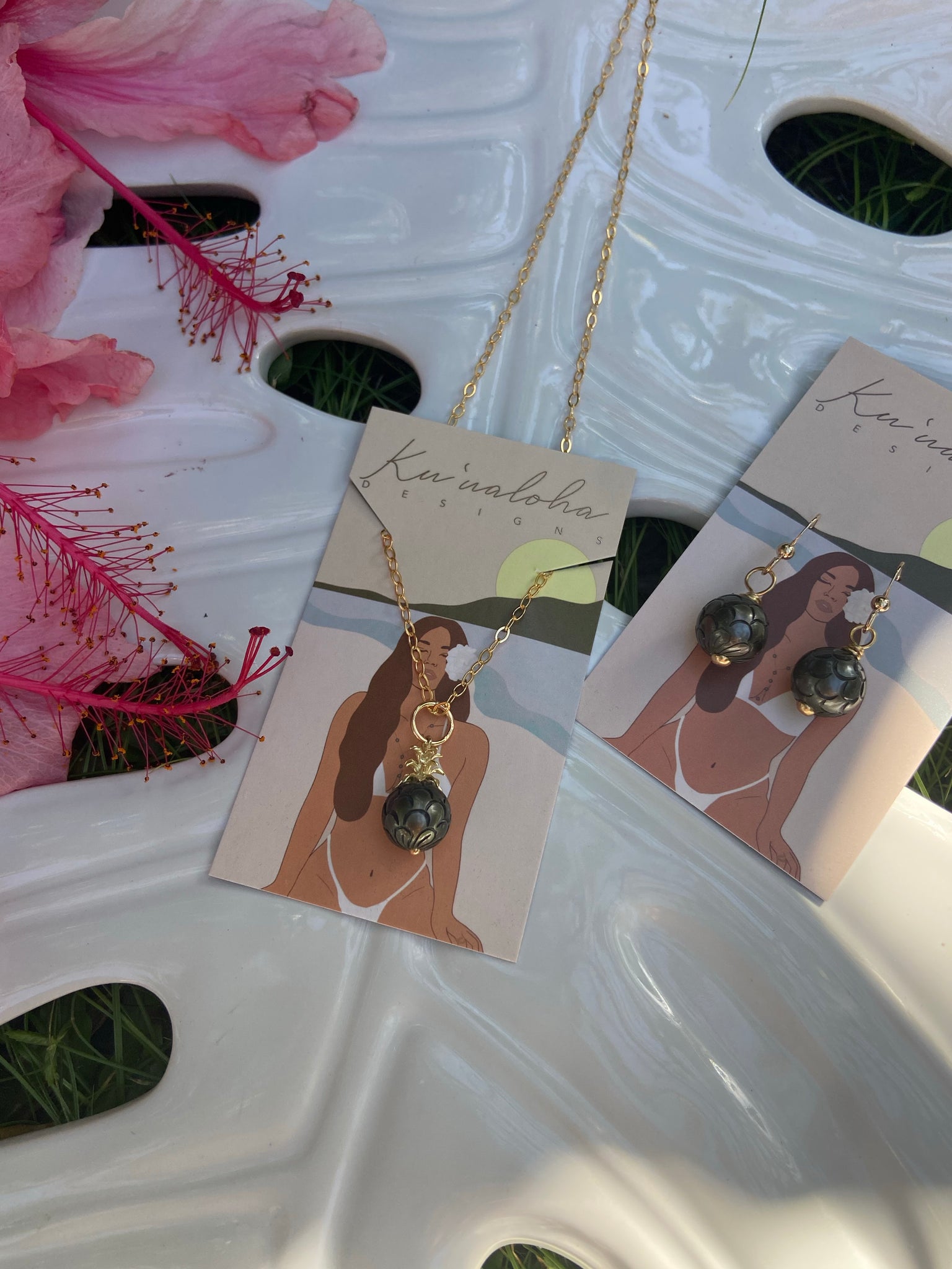 18” pineapple necklace make with hand carved Tahitian pearl 12mm. Includes mermaid earrings with 14k gf hooks. You will love this set!!