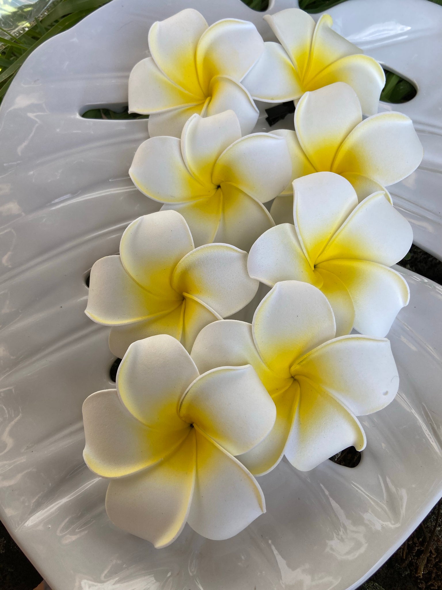 Hawaiian made plumeria hair clips. Look beautiful in your ear, hun it ponytail.