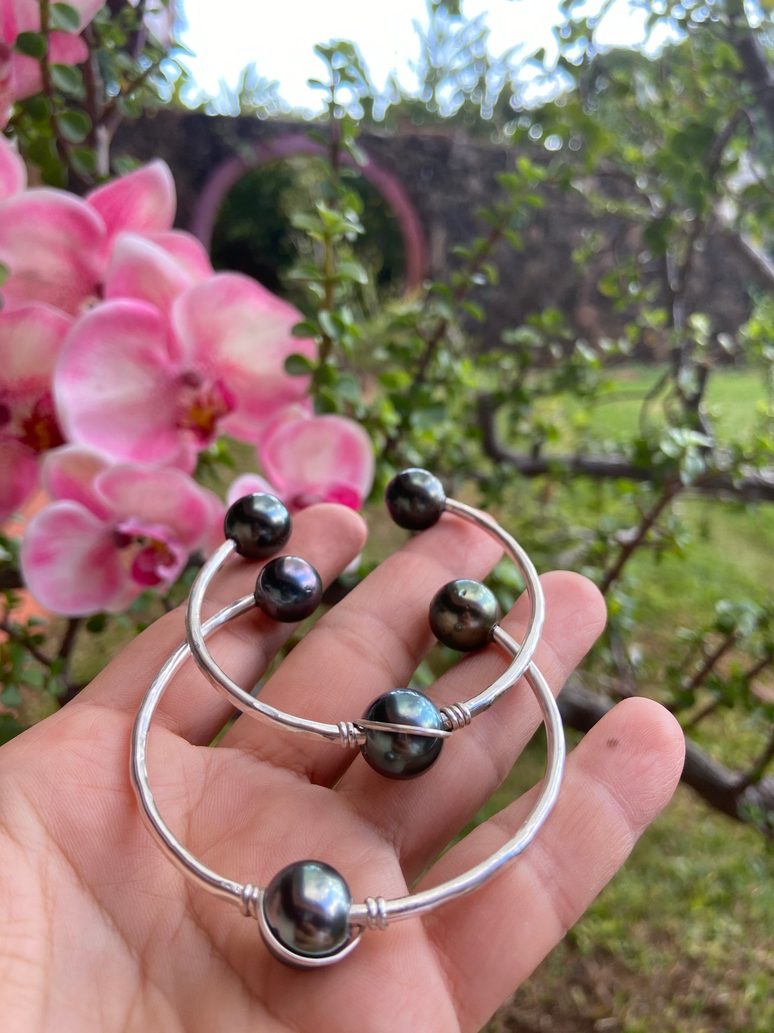 10 gauge sterling silver filled wire with 12mm Tahitian pearls (3). One wrapped in place.