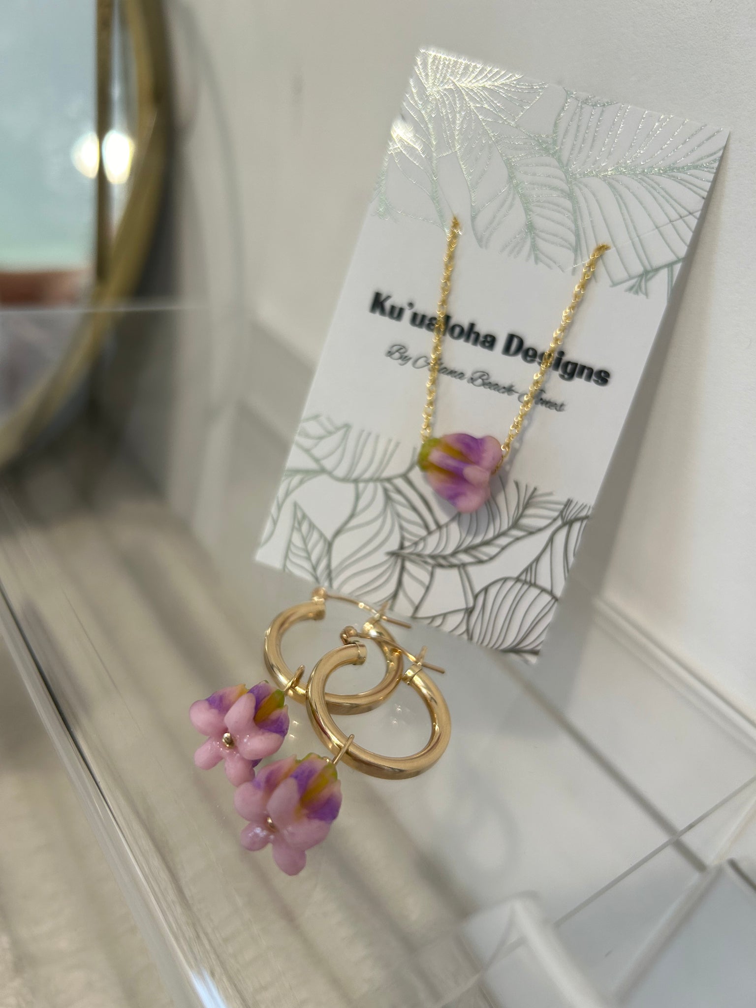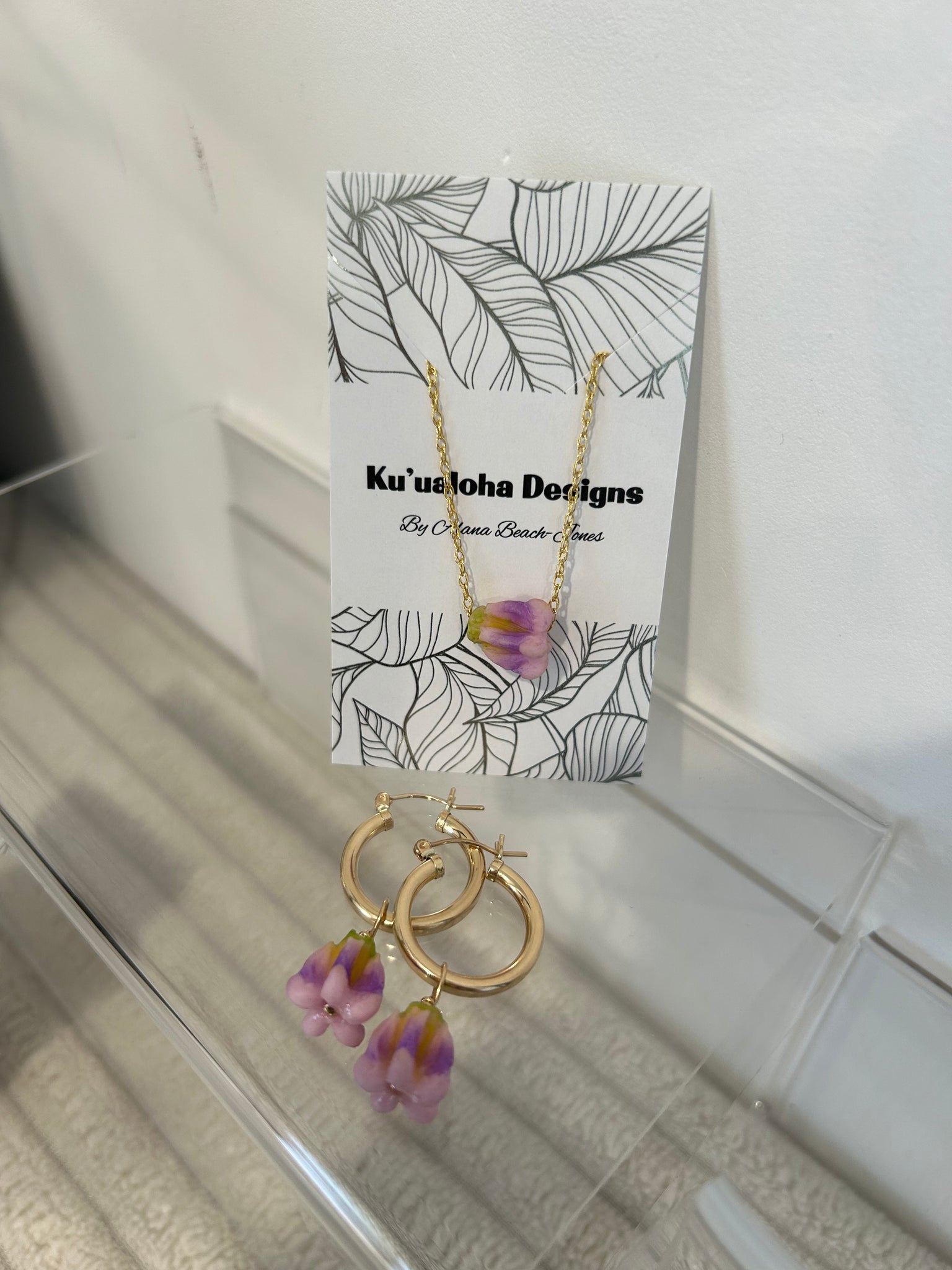 Beautifully handcrafted Crown Flower set that includes a floating flower necklace and 14k gold filled hollow hoop Huggie earrings 25MM with flowers.