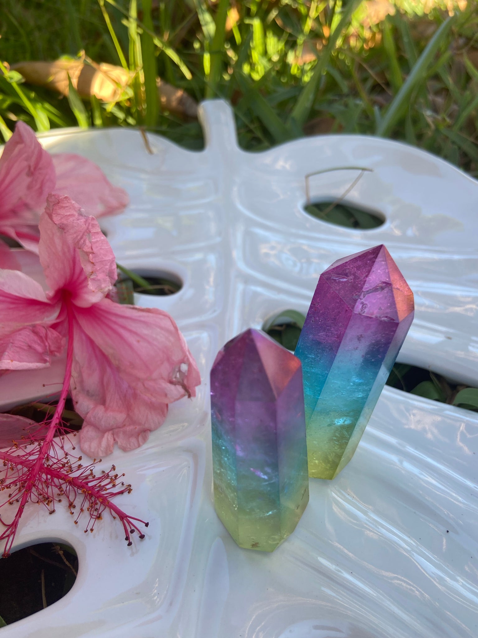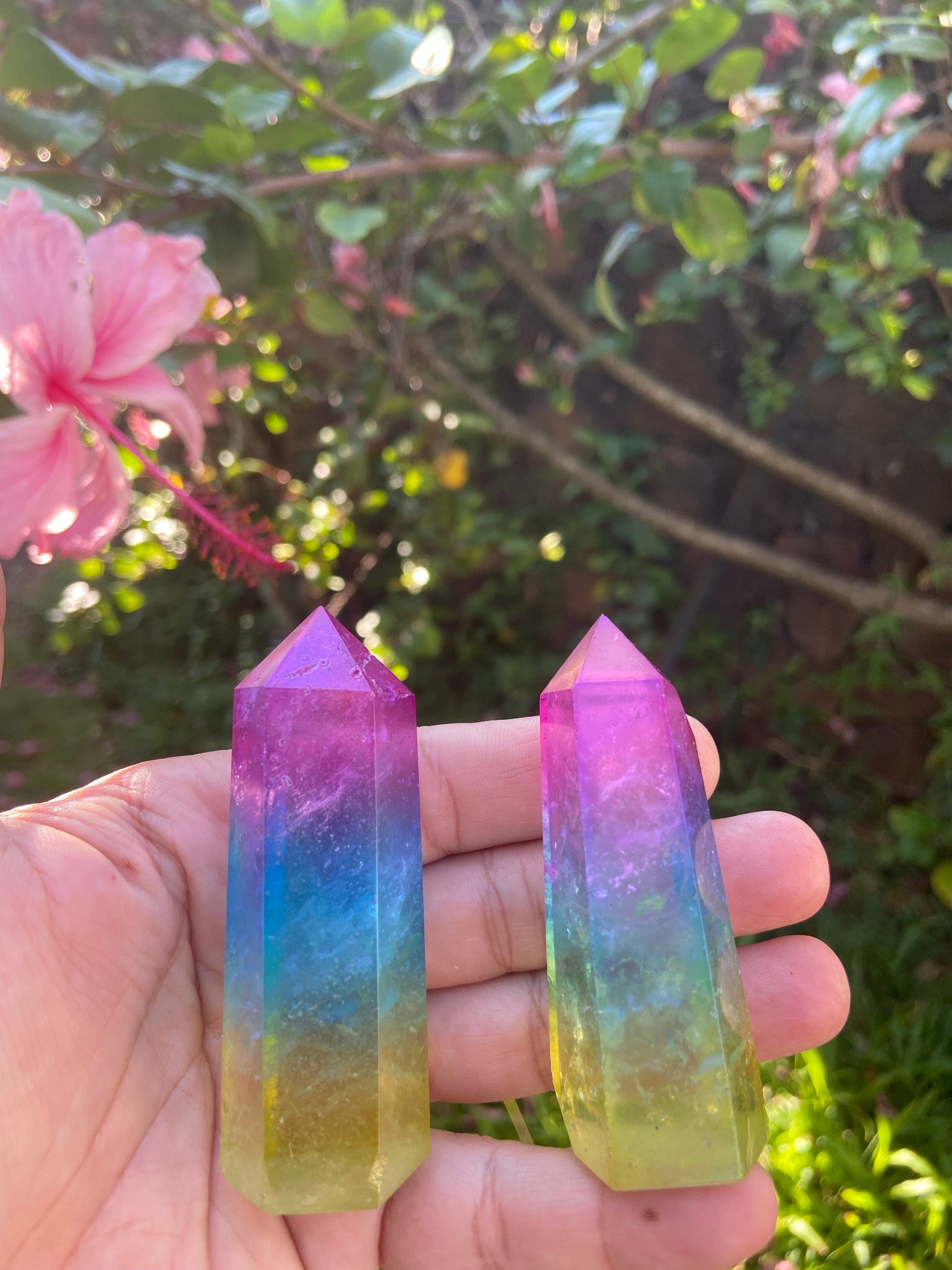 Add some rainbow bliss to your stone collection with these beautiful, unique rainbow Quartz. Two sizes available 3” and 4” wand.