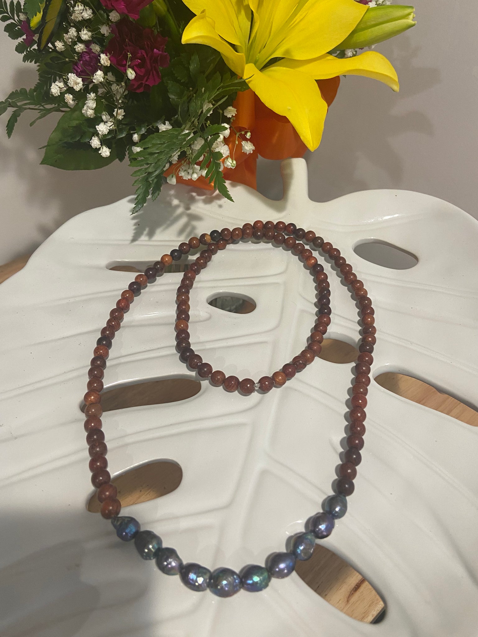 Gorgeous, long sandalwood necklace with enhanced Edison pearls.