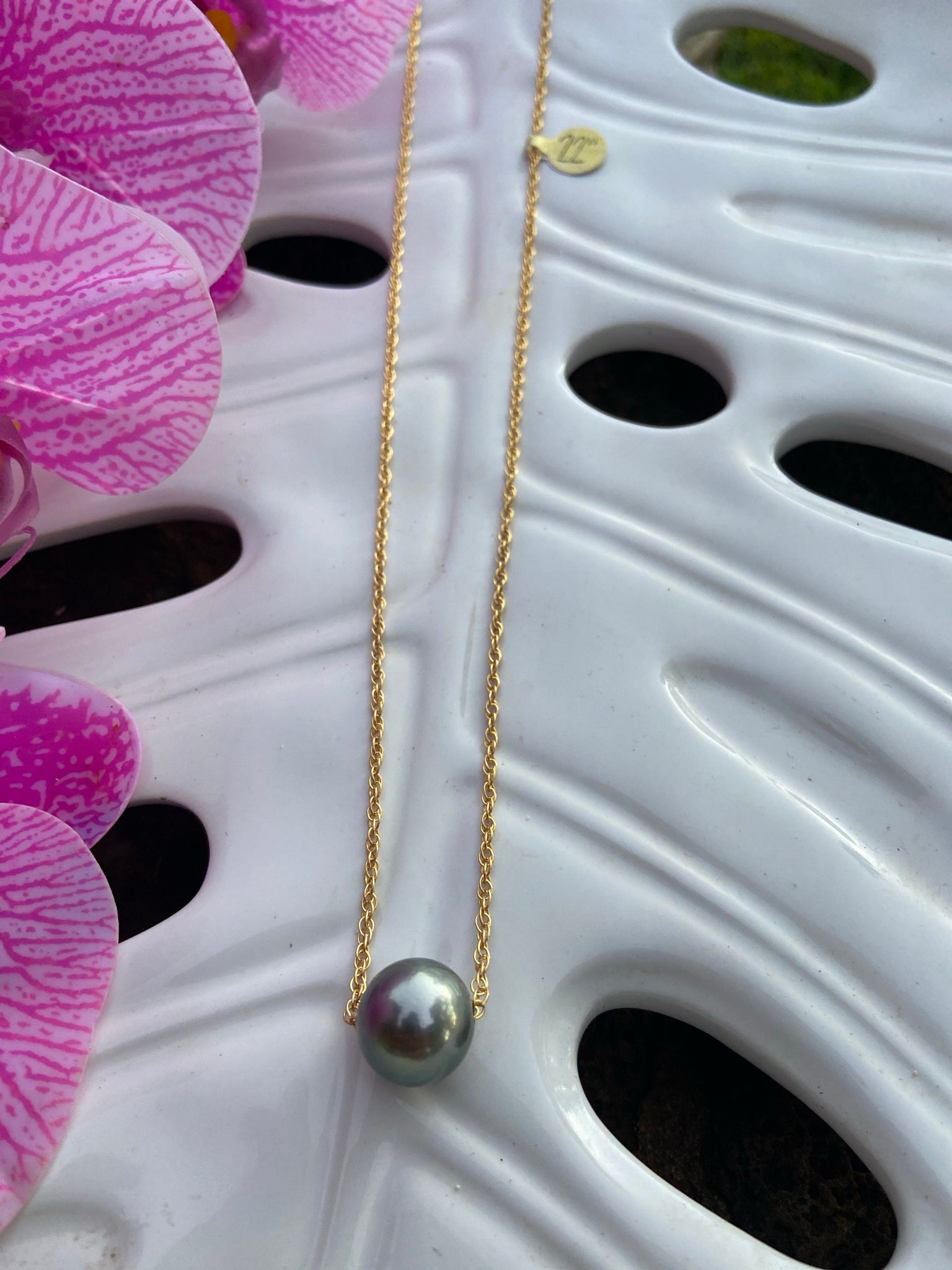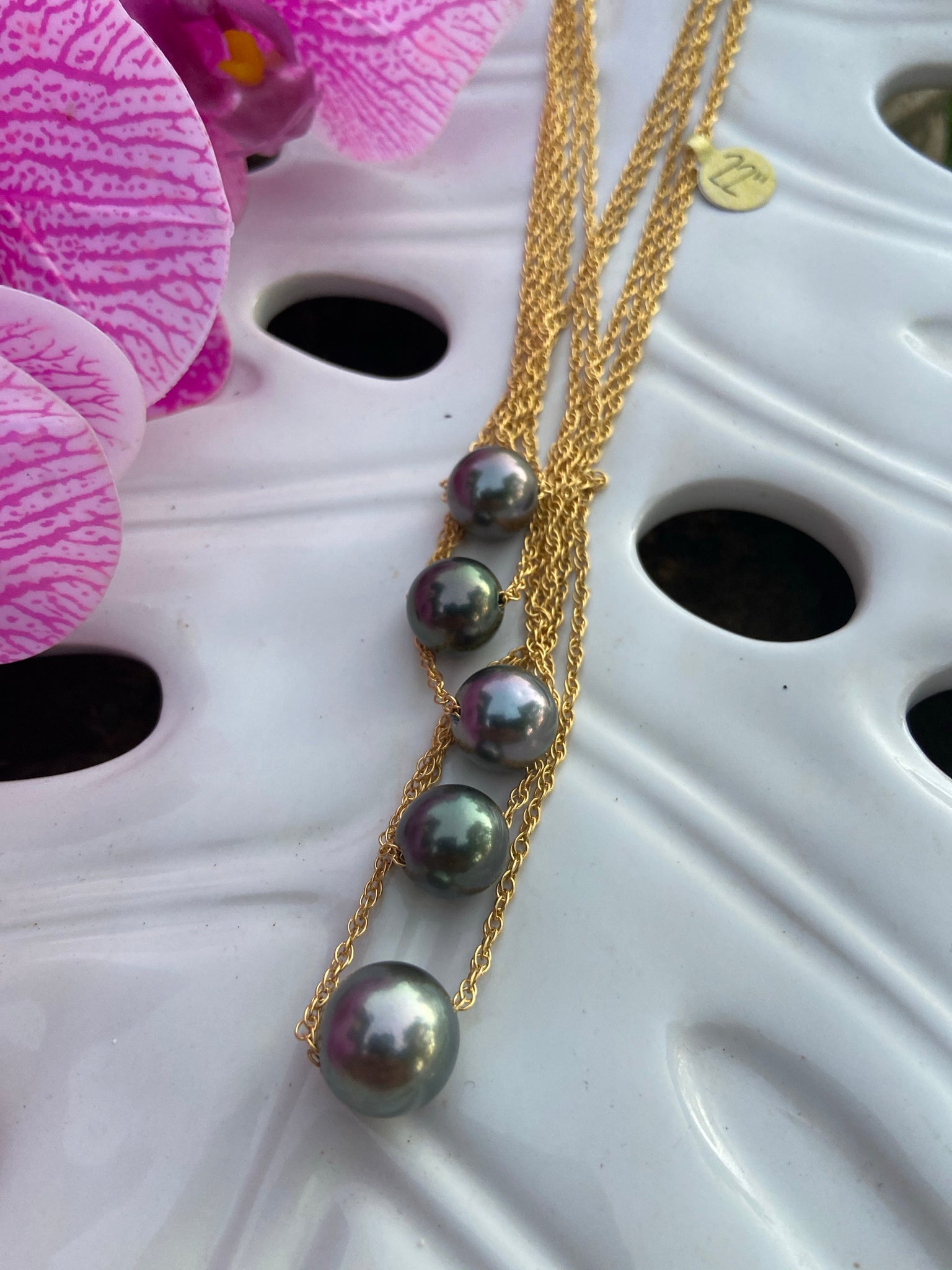 Beautiful, premium grade AA Tahitian pearls, peacock/black/gray in color. Floating on 14k gold filled double rope chain. Choose your exact necklace from the drop down box below.
