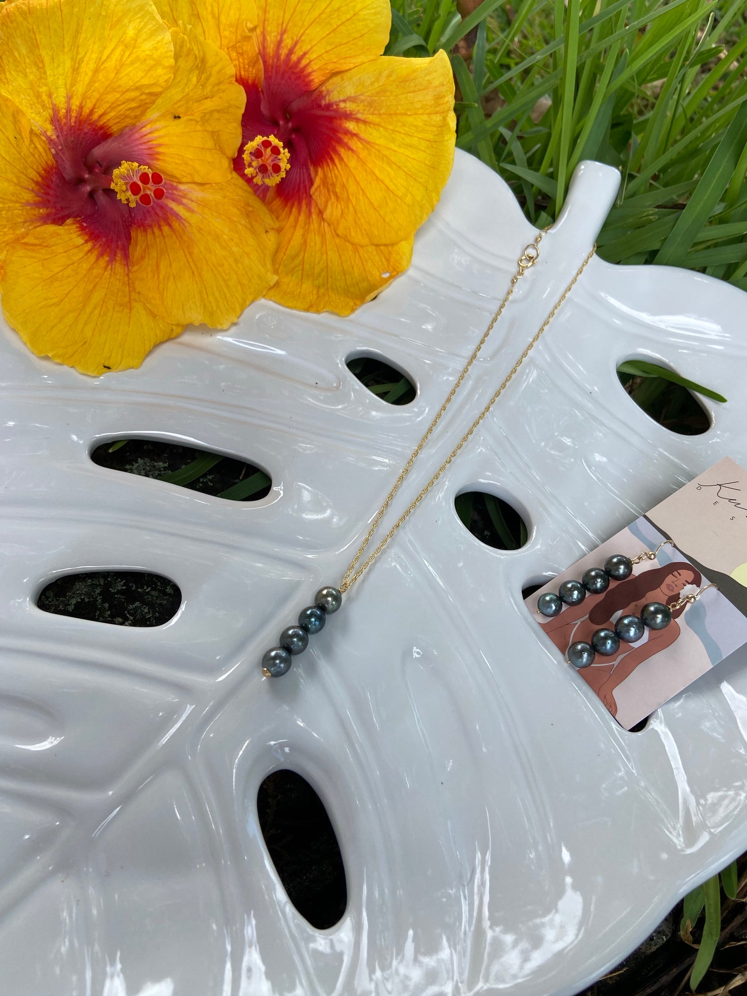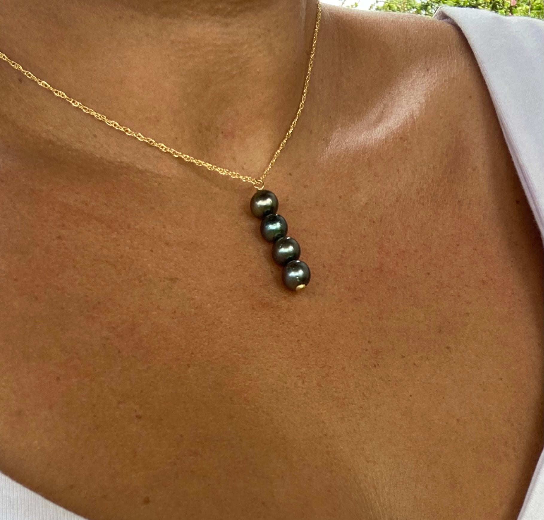This gorgeous, handcrafted necklace is 17” long with four Tahitian pearls 9mm in size. 14k gold filled wheat chain.