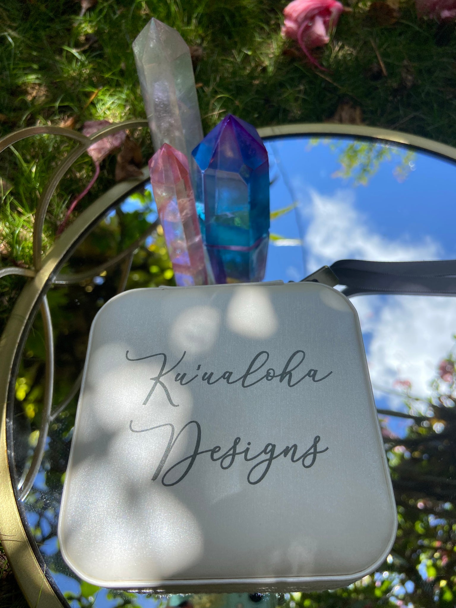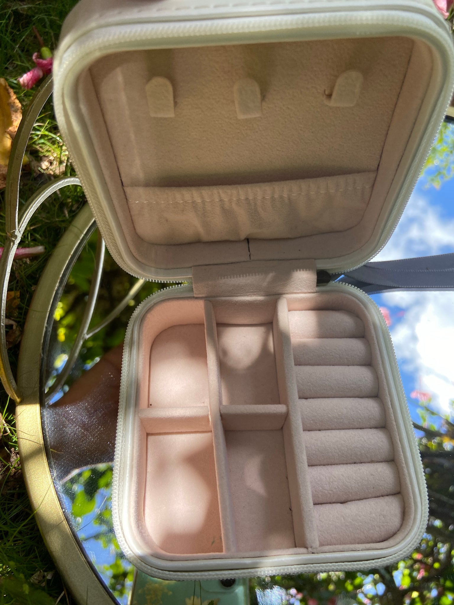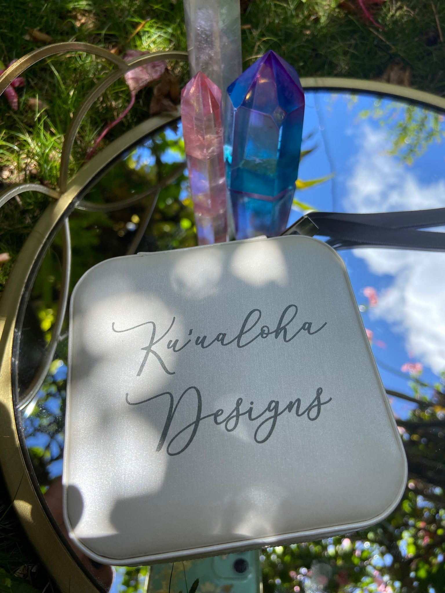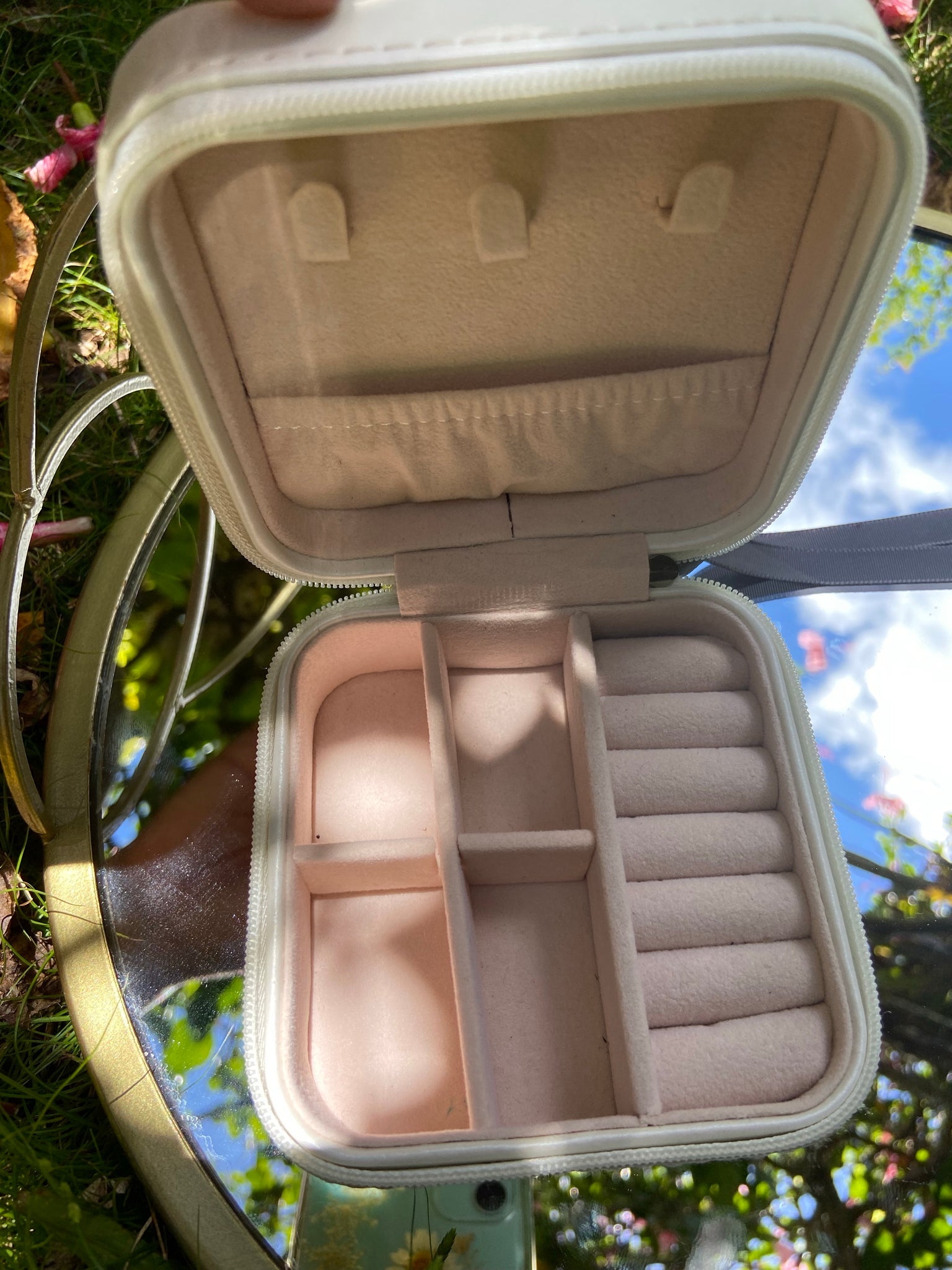 Our signature travel case will never let you down. Organize all of your jewelry and keep it safely with you in your purse or suitcase. Dimensions are 3x3x1. Black with rose gold lettering or Ivory with charcoal lettering.